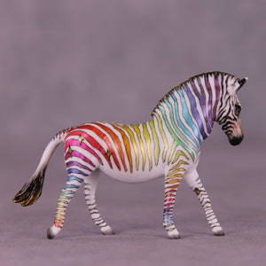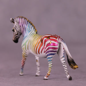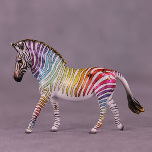 Reverie is such a special piece. Starting with our Chip Pony mold, Melanie Miller has nailed her new Zebra customization, with a repositioned and tucked head and neck, new standing-up zebra mane, added dewlap on her neck, rounded large zebra ears, and of course the longer zebra tail. Jess Hamill painted her to an incredibly intricate rainbow metallic zebra with golden detailing and a sparkle added here and there for good measure! Extra finish is not available on this piece, she is already just the right amount of shimmery!