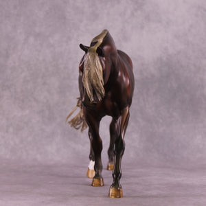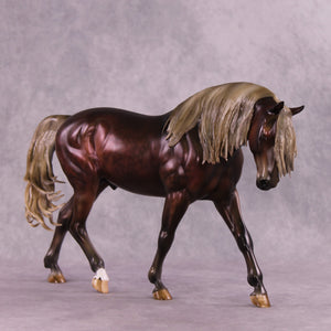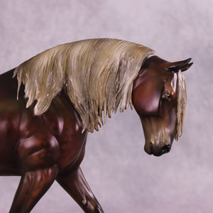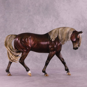 “Reverie” begins on our Irish Draught sculpture, and Mona gave him an eye catching tucked head customization, plus a super detailed extra long mane, tail, and forelock with extra tendril customizing. Julie then painted him to a luminous silver bay with gorgeous dappling, shading, hoof stripes, ermine spots, and more. He GLOWS.