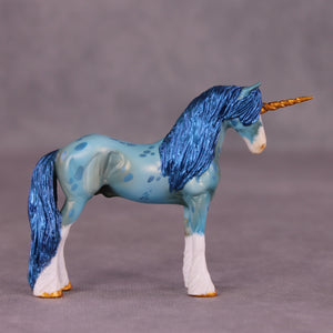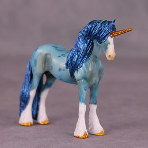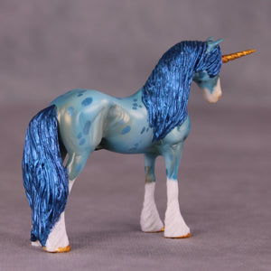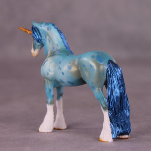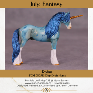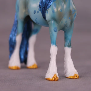 Robin begins on our Chip Drafter sculpture, and Kristen gave him a lovely new head and neck position, a brand new long mane, tail, and forelock, carved feather detailing with cloven hooves, and a unicorn horn! She then painted him to a beautiful shaded literal blue roan with corn spotting, four white socks and a wide blaze, and tons of details throughout.