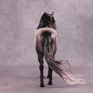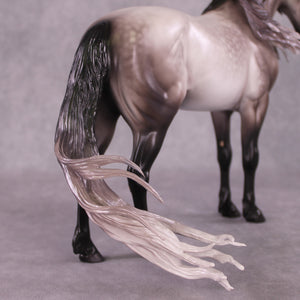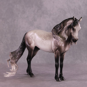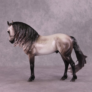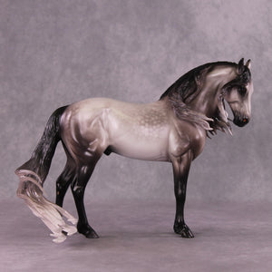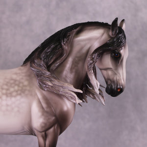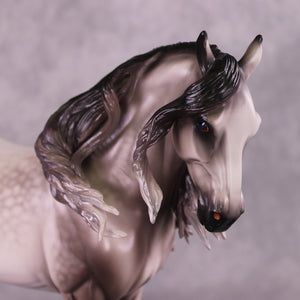 “Rocket Man”, like the rest of this batch, marks the last Andalusian we will offer that features Caroline Boydston’s paintwork and Mona’s customizing. He has a gentlemanly tucked and turned head, a heavy mane, tail, and forelock that are all twisting and blowing forward in the wind. To set off this gorgeous customization, Caroline went with her signature heavily dappled grey and no white markings. A once in a lifetime piece.