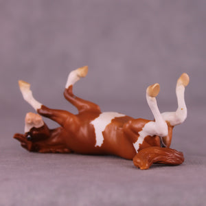 Erika took our Chip Rearing Horse mold and turned her upside down – literally! She customized her to a mare, and then gave her an extreme factory customization to an accurately balanced rolling horse! Both hips, both shoulders, all legs, mane, tail, and back have been customized to achieve this look. Erika finished her in a lovely shaded chestnut pinto to perfectly round out this special little piece.