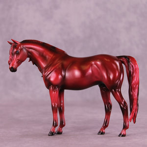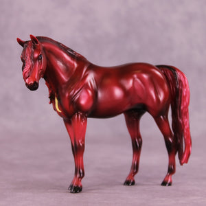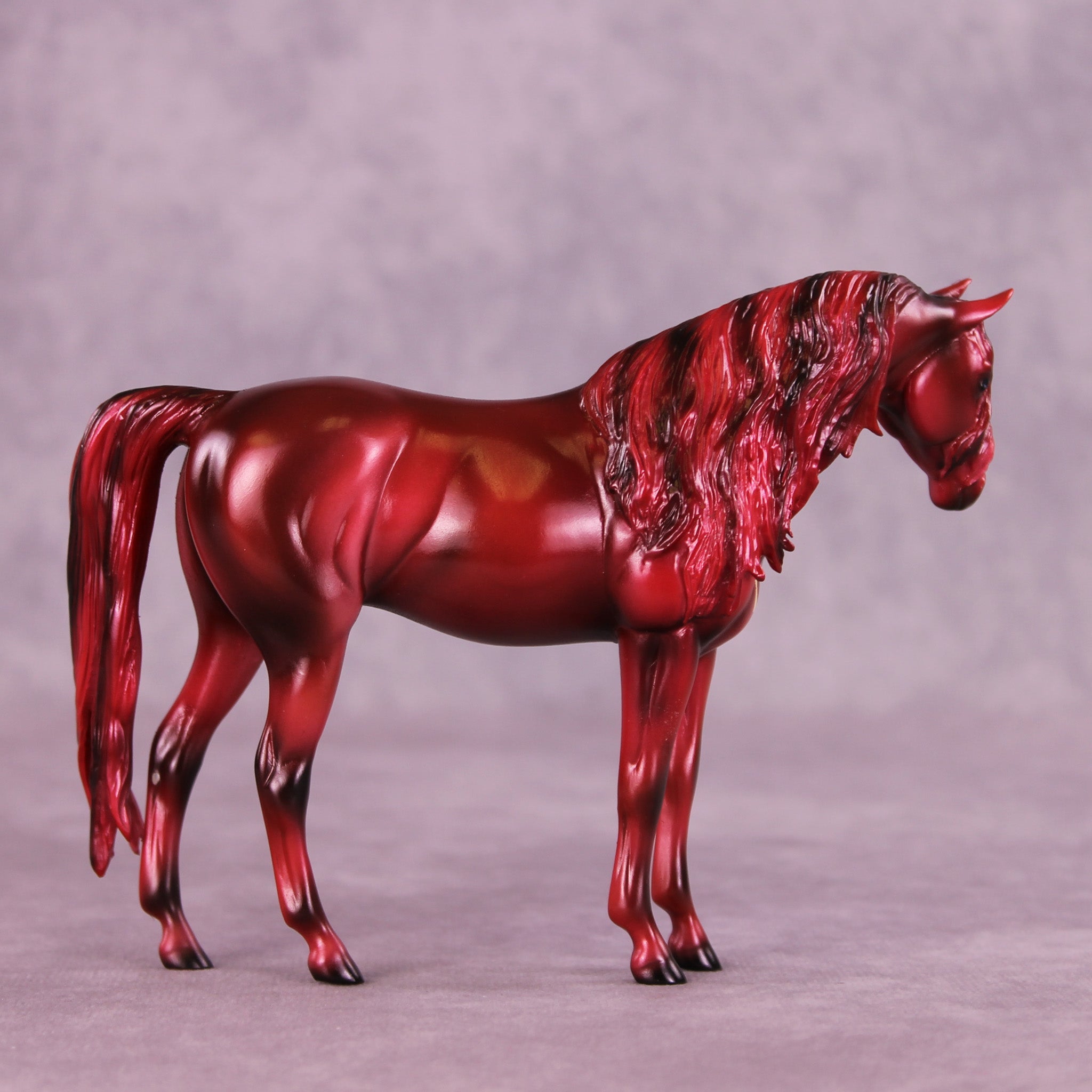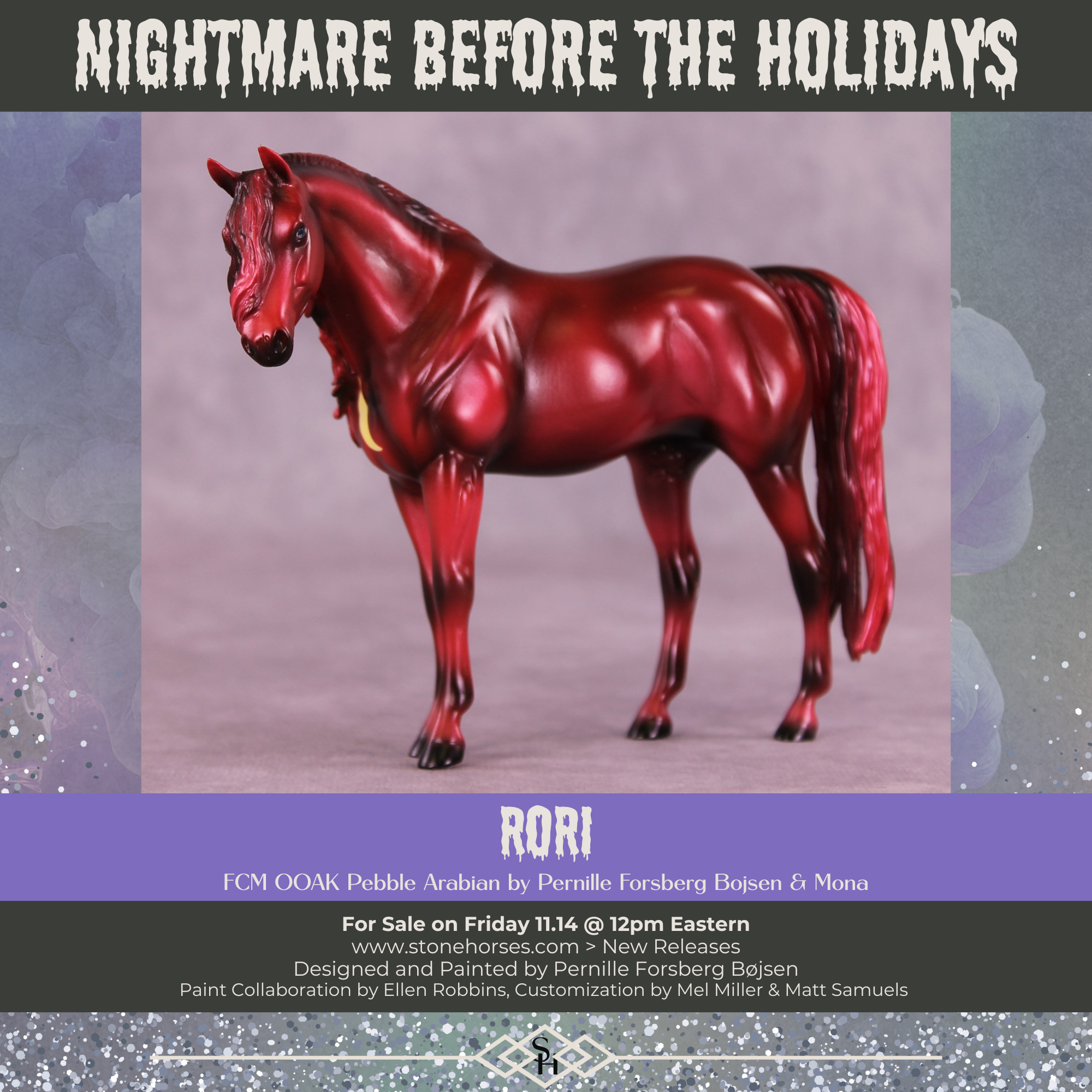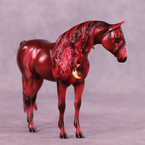 Rori is a very special piece. Starting with our Pebble Arabian Mare, she was customized by Mona to have an extra detailed long tendril mane and forelock, and extra detailing added to her tail. She was a teamwork done in cooperation with Rori, a kiddo who is sometimes around at Stone Horses. Rori did the drawing and color instructions for her, and Pernille painted her. The moon is a symbol of the many moons over Shipshewana and the phases and changes we all go through in life. Her red color is very strong and symbolizes courage.