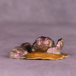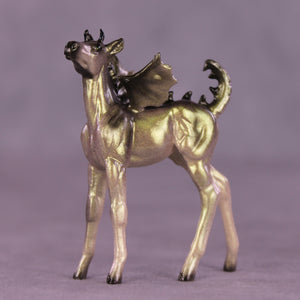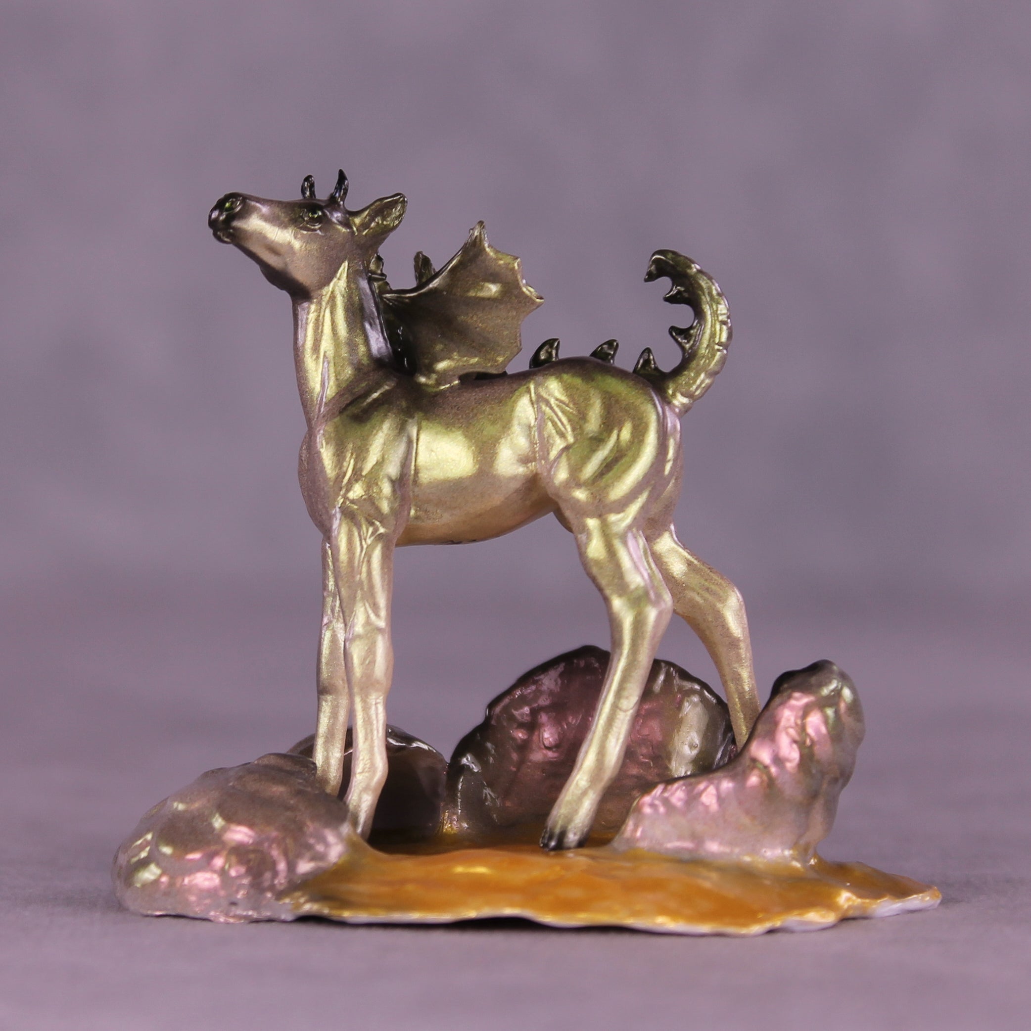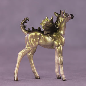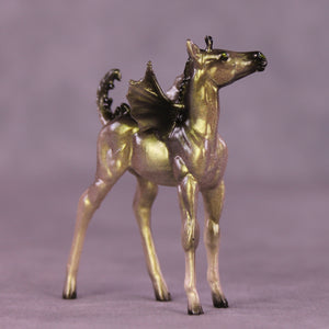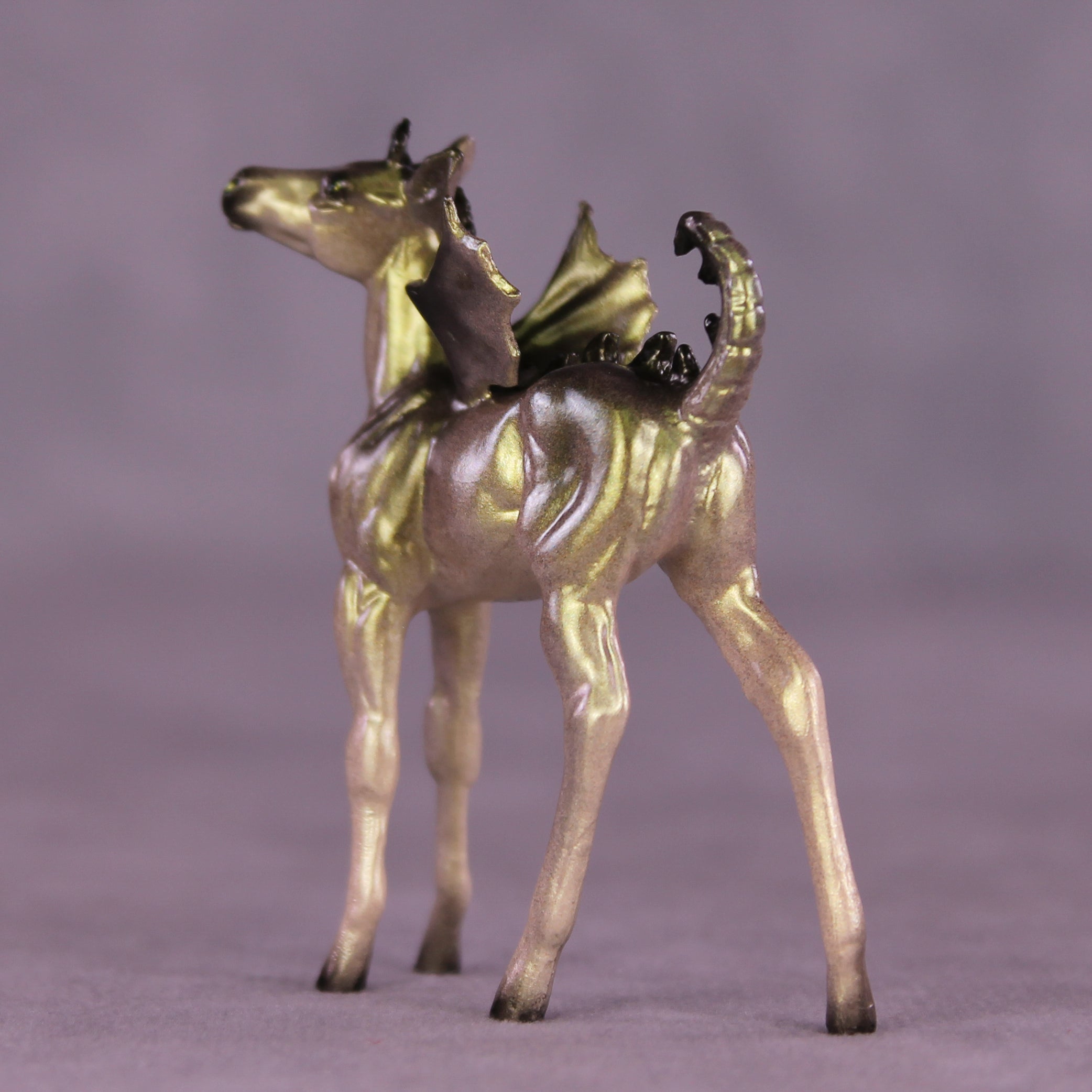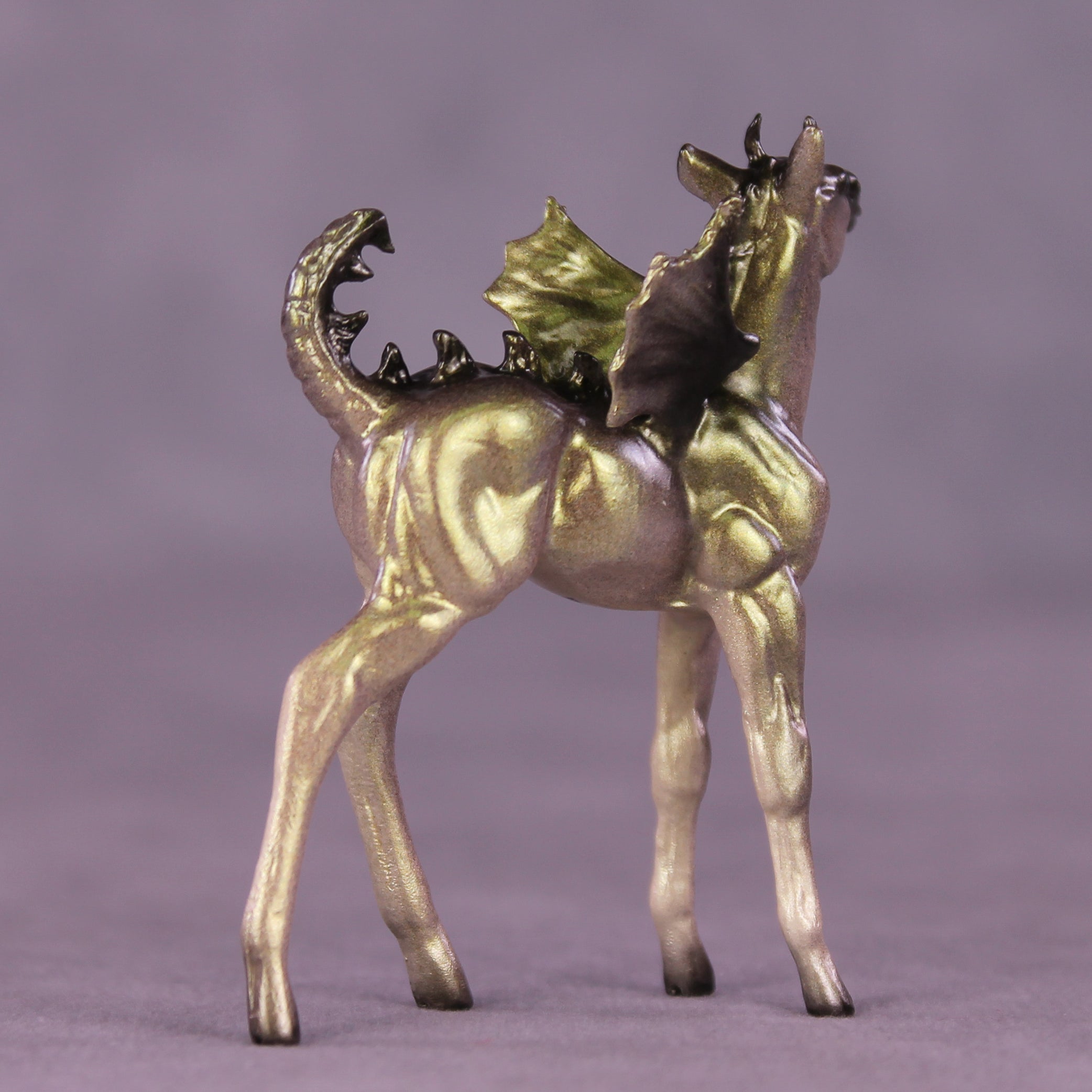 You’ve never seen our Chip Foal like this! Tiffany gave her a drastic customization to a newly hatched baby horse dragon, complete with spines down her neck, back, and tail, hand sculpted dragon wings, little horns, and a scaly curled up tail. She also comes with a hand customized detached diorama made from the same plastic as our horses, with bits of hatched egg laying around her feet. Rune and her eggshells are both painted in shades of metallic greens and purples and golds, with tons of shading and detailing! Her mother, Celine, is available separately, but we included a photo of them together to show how thoughtfully Tiffany customized this pair.