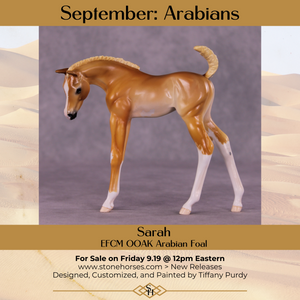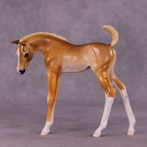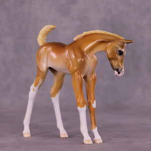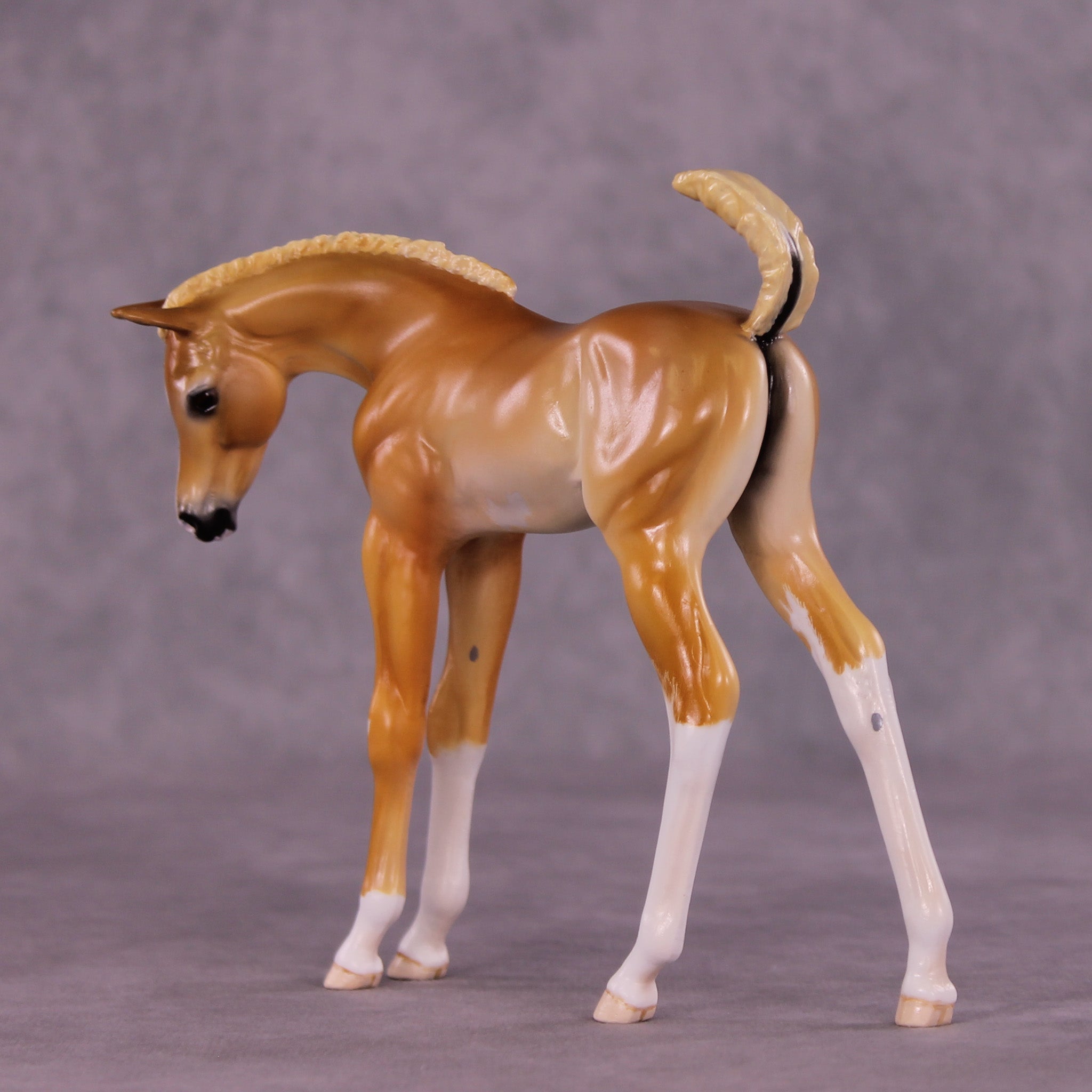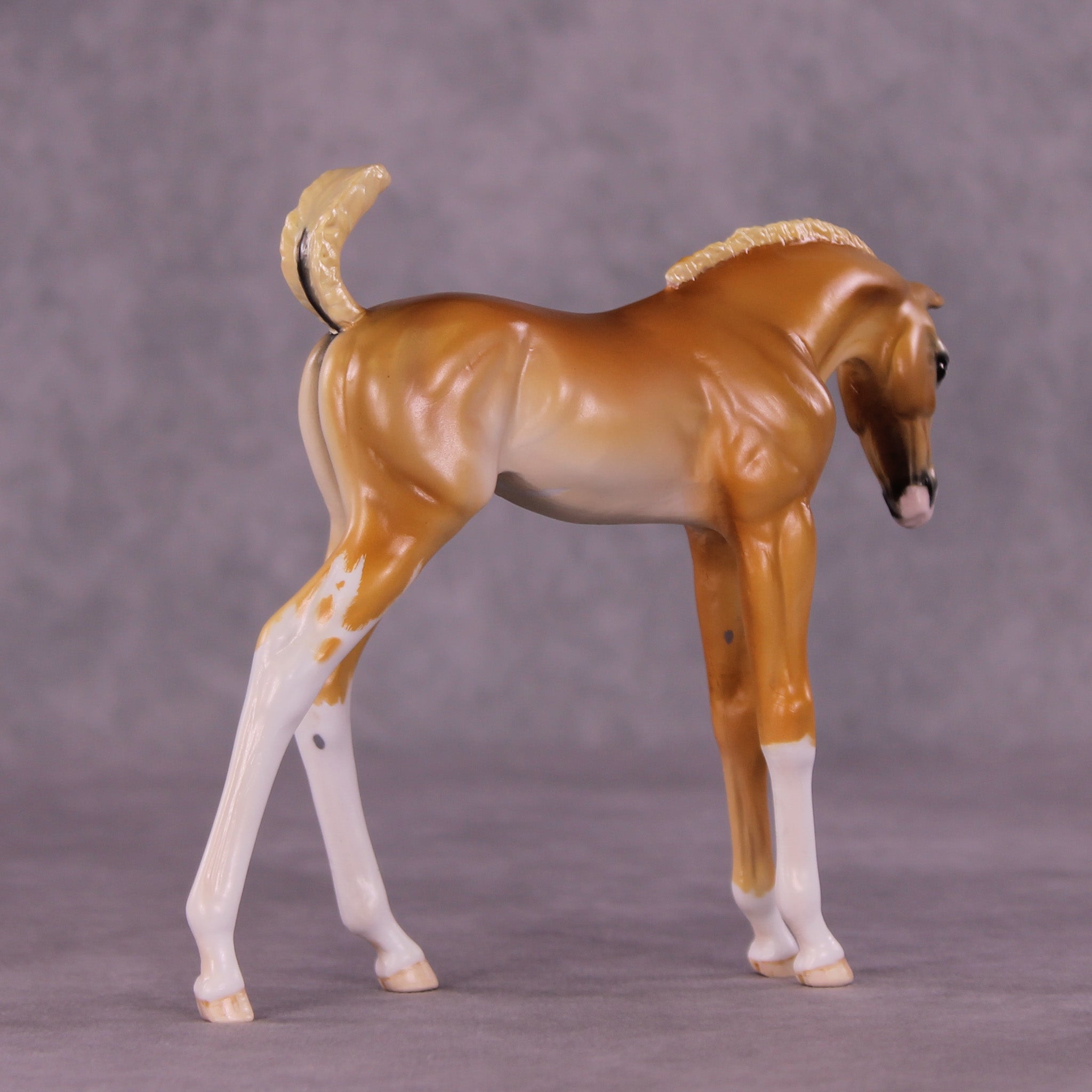 Sarah begins on our Arabian Foal mold, and Tiffany gave her an extreme downward head and neck position – she is really inspecting something closely. She also has a customized lifted tail and tail bone, and then Tiffany finished her to an adorable baby chestnut with intricately high white markings and a blaze!