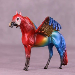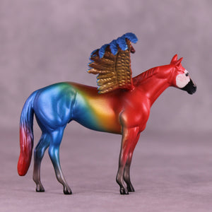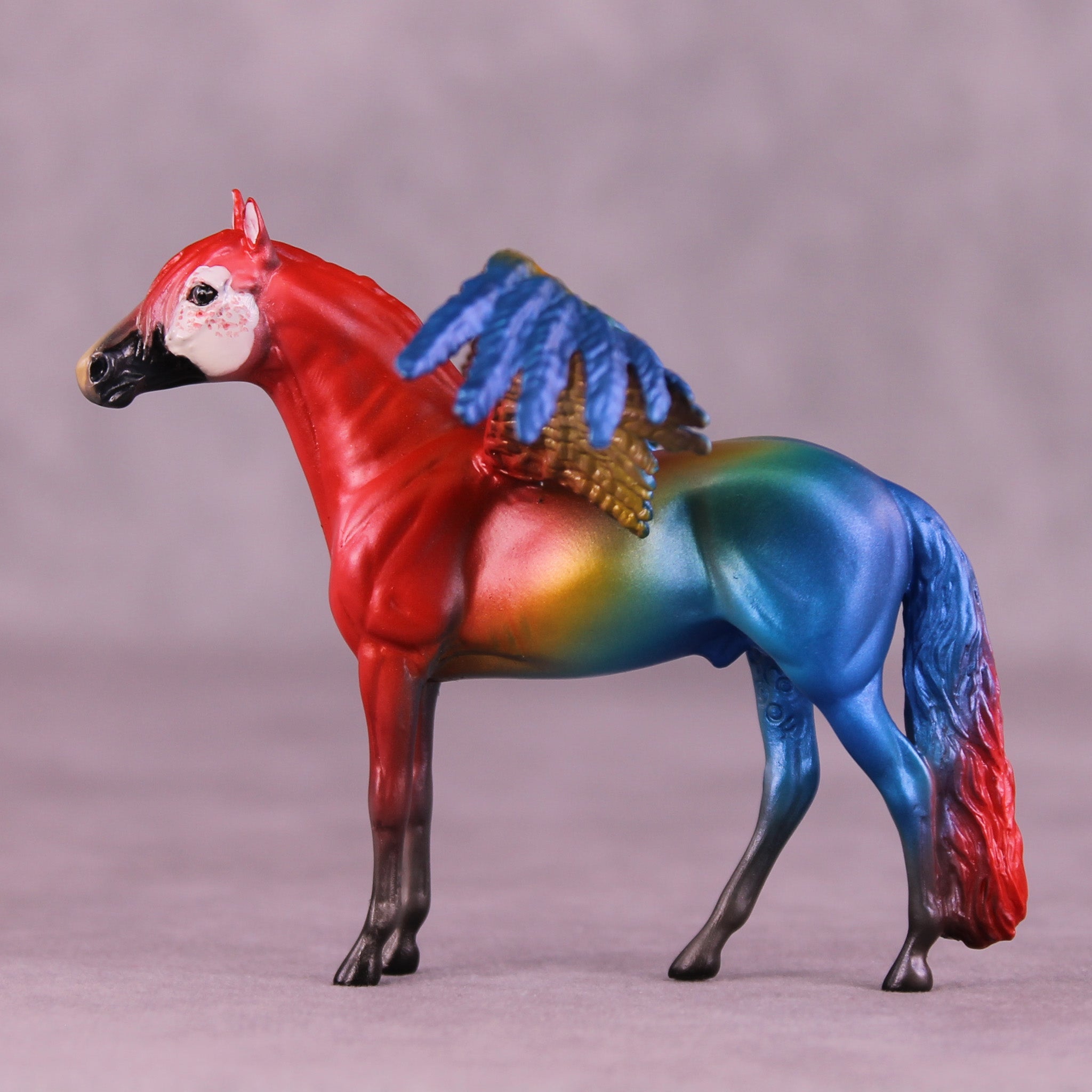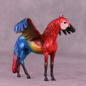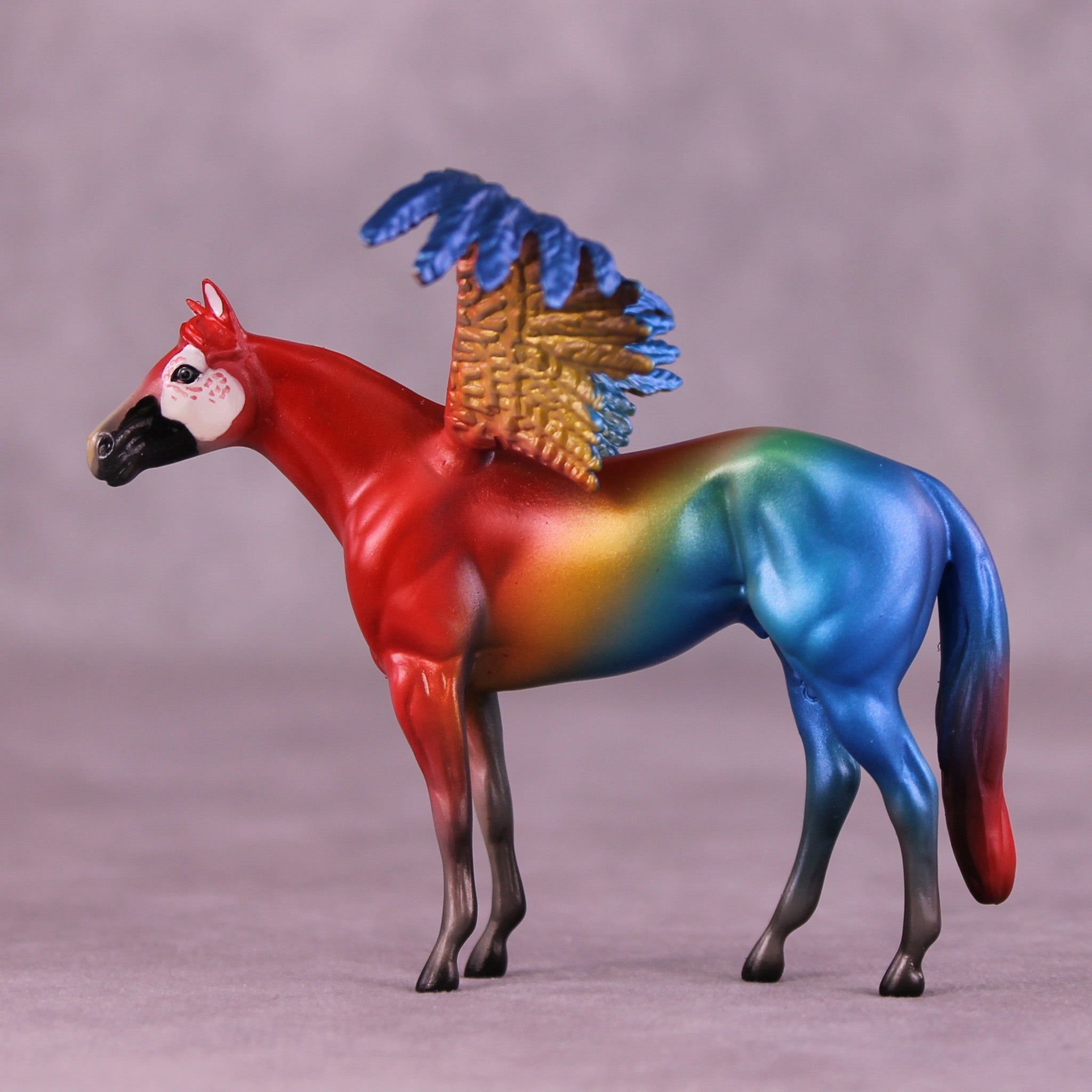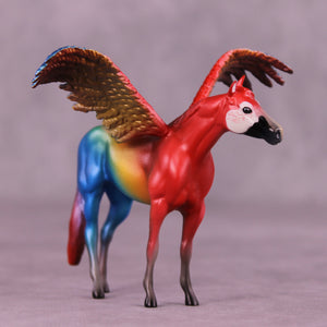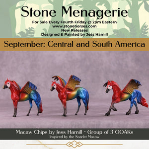 Jess has expertly recreated five different varieties of Macaw, each in a group of three one of a kind pieces with extra customized taking-flight wings! Representing the Blue and Gold Macaw, the Harlequin Macaw, the Hyacinth Macaw, the Military Macaw, and the Scarlet Macaw, these five groups of three OOAKs are ready to ship now with no extra finish options available.