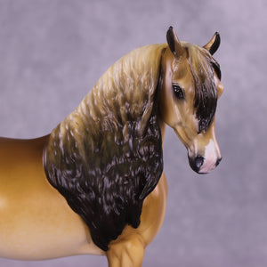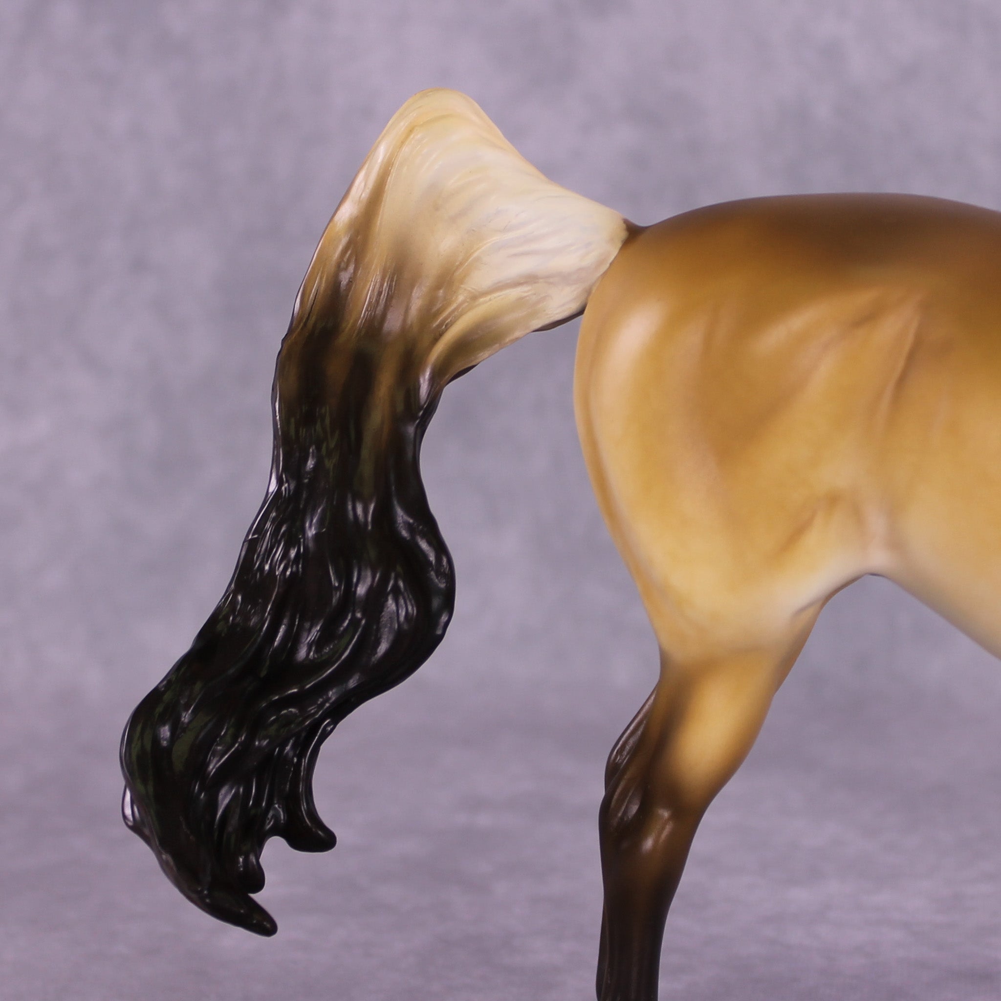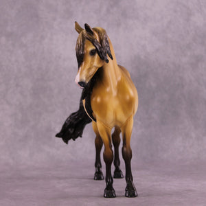 Secret Royal starts off with our Morgan mold, but you can barely recognize him. Tiffany customized him to a her and beefed up her belly into a sweet pregnant mare, complete with an EFCM swap with our Arabian Mare's head. She has a whole new customized mane, tail, and forelock of course, and Tiffany painted her to the most stunning dappled frosty buckskin.