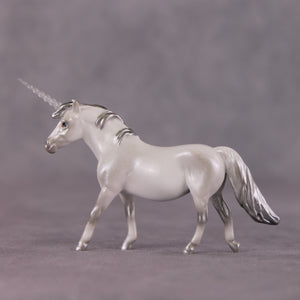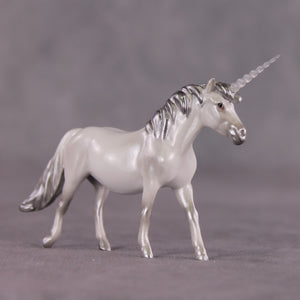 • It features a customized clear resin unicorn horn produced by Mel Miller Equine Art. Horns will vary in a selection of fun horns.