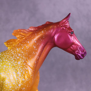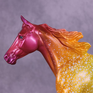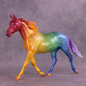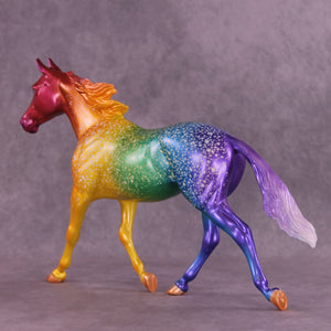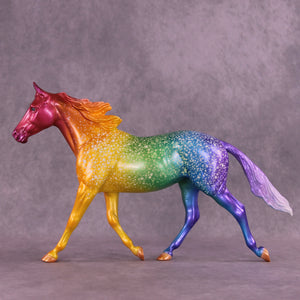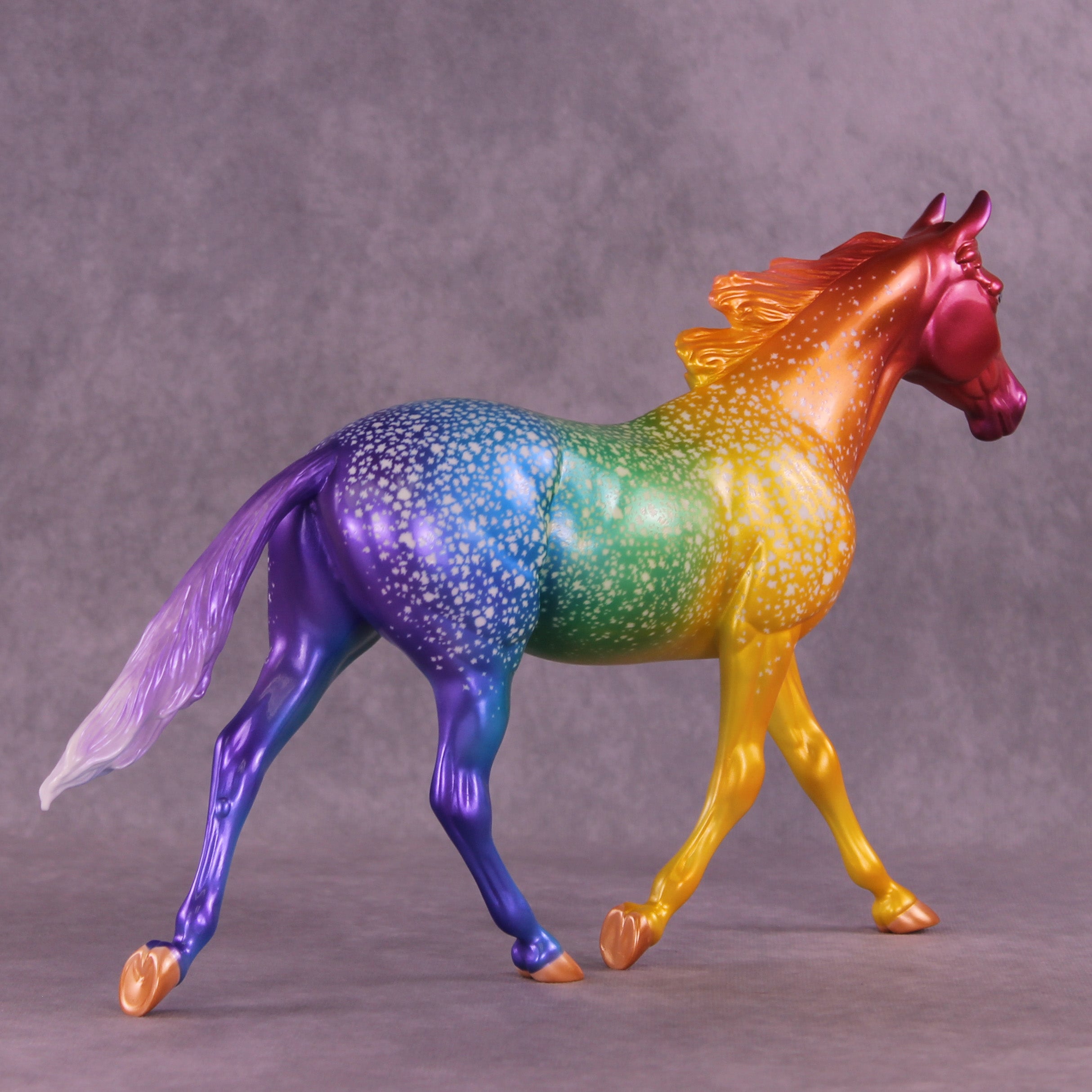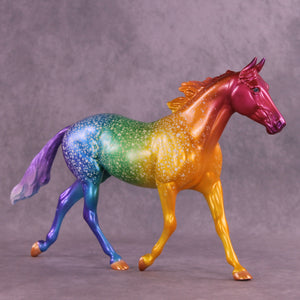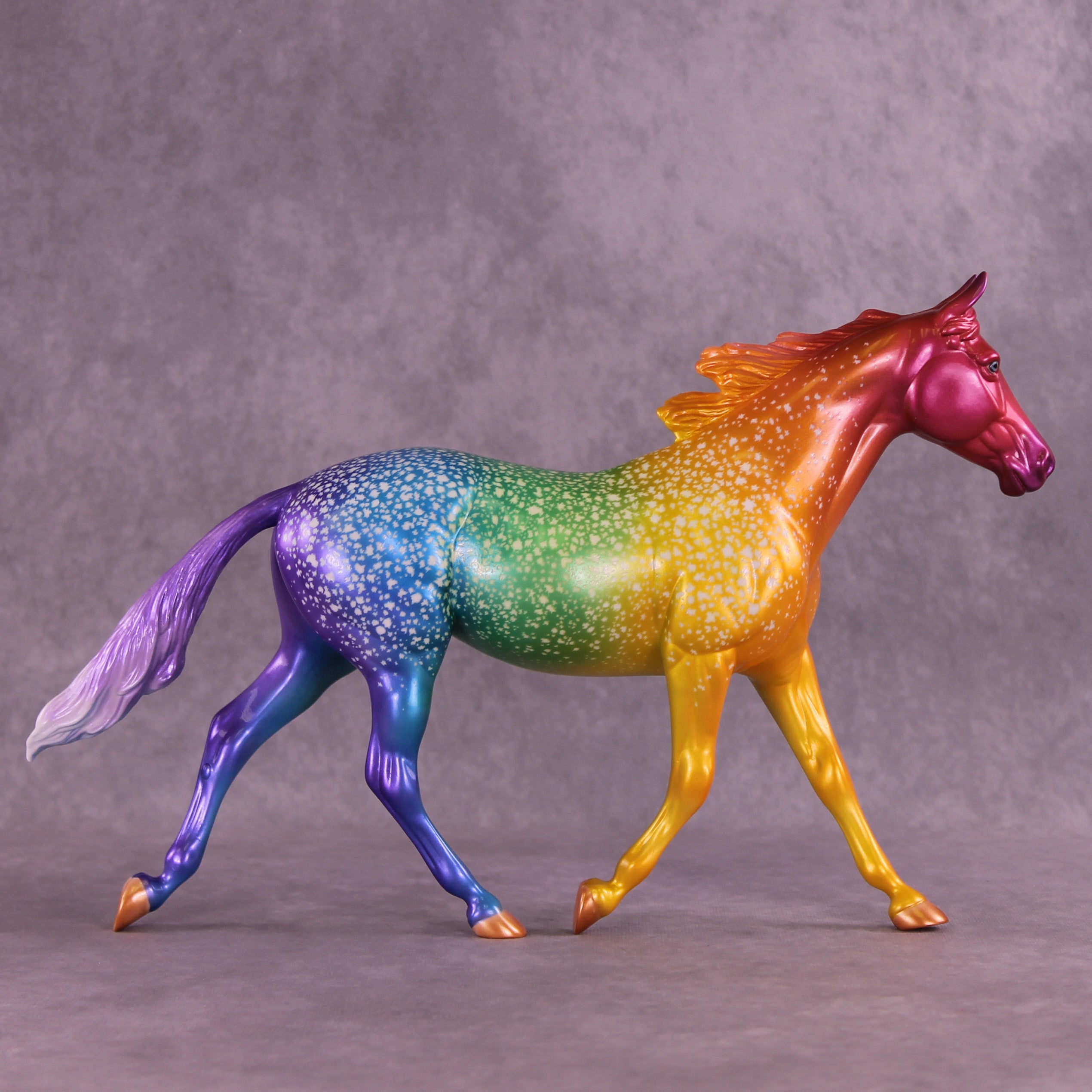 Shombré by Leah Koerper is sure to be a standout piece in any collection. Starting with the Palouse sculpture, Leah gave her a vibrant ombre rainbow coat with thousands of hand etched star-inspired spots in a glossy finish and shaded bronze metallic hooves. This labor of love will be an eye-catching addition to your herd.
