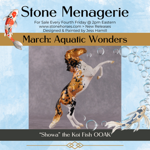 In this month's Menagerie, explore the beauty of aquatic themes with our Koi-inspired pebble model horses. Each piece, crafted with Jess Hamill's artistic touch, features intricate fish scale details and a variety of Koi color options, capturing the elegance of these magnificent creatures. Dive into this enchanting collection with us!