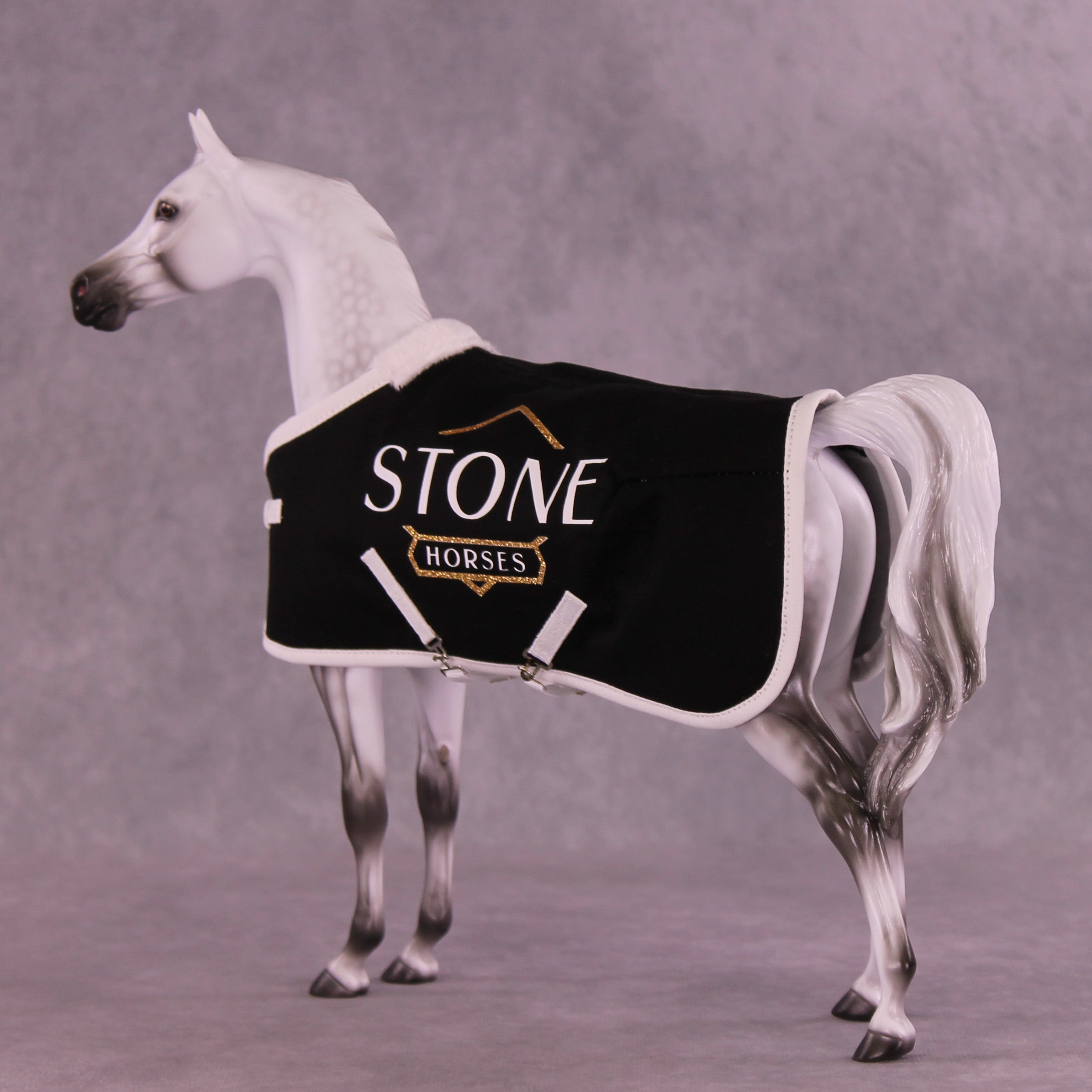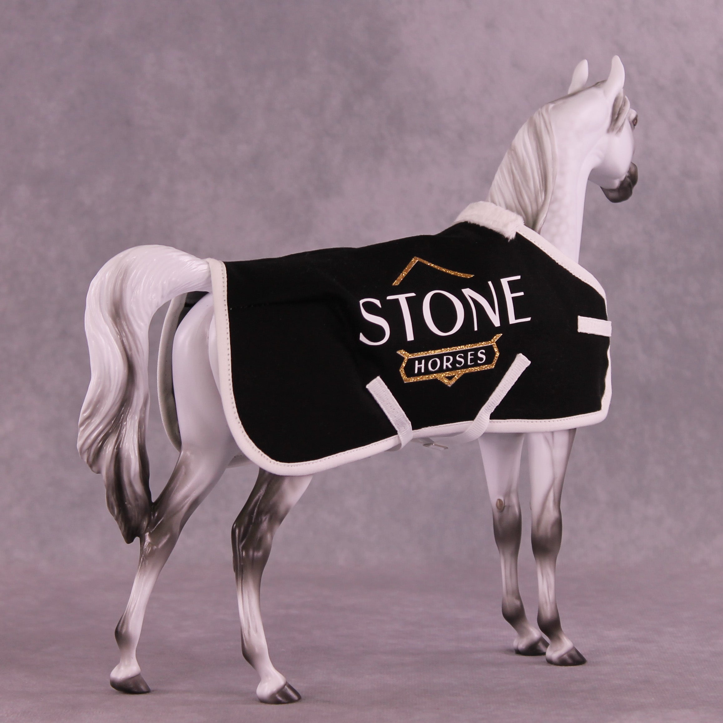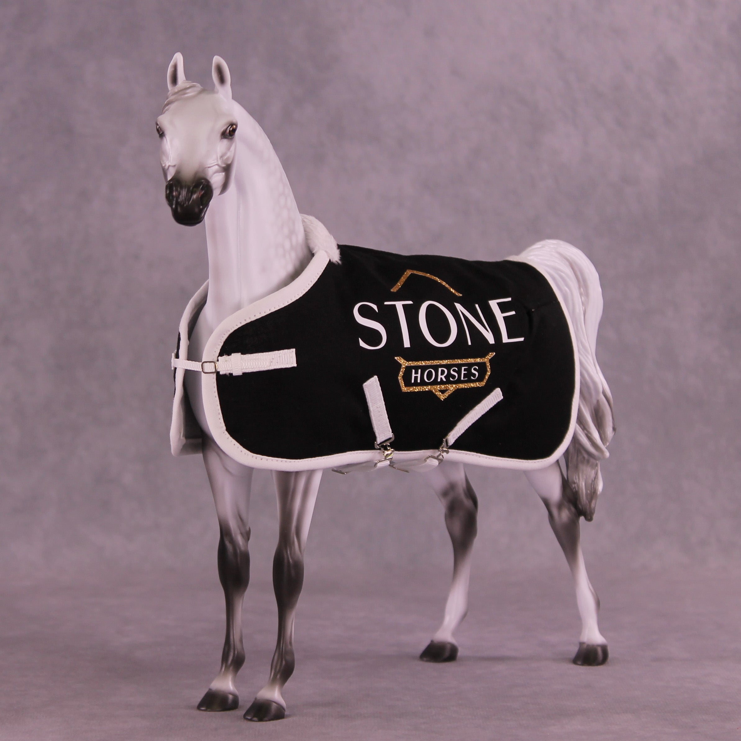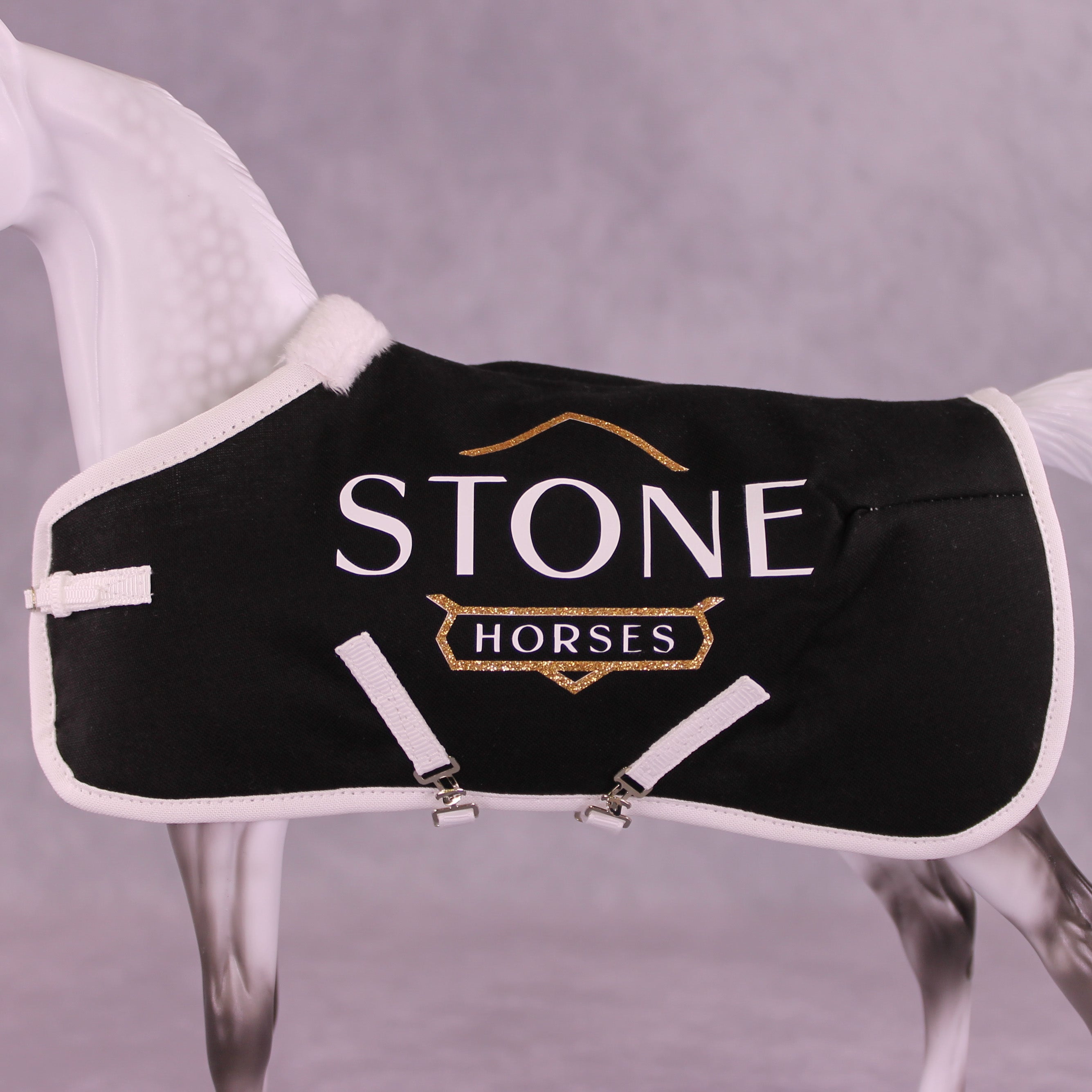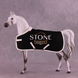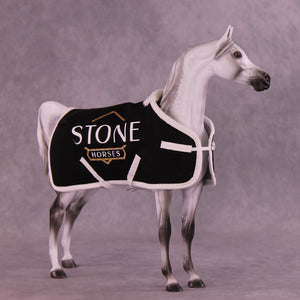 Trinity Honaker is the best in the business when it comes to scale miniature blankets, and we are thrilled to have her work as part of this special offer! These blankets feature all her usual details, with fuzzy lining at the withers, stitched quilting and piping, two adjustable surcingle belly strap closures, an adjustable front closure, and of course - the Stone Horses logo in glittering vinyl on both sides.