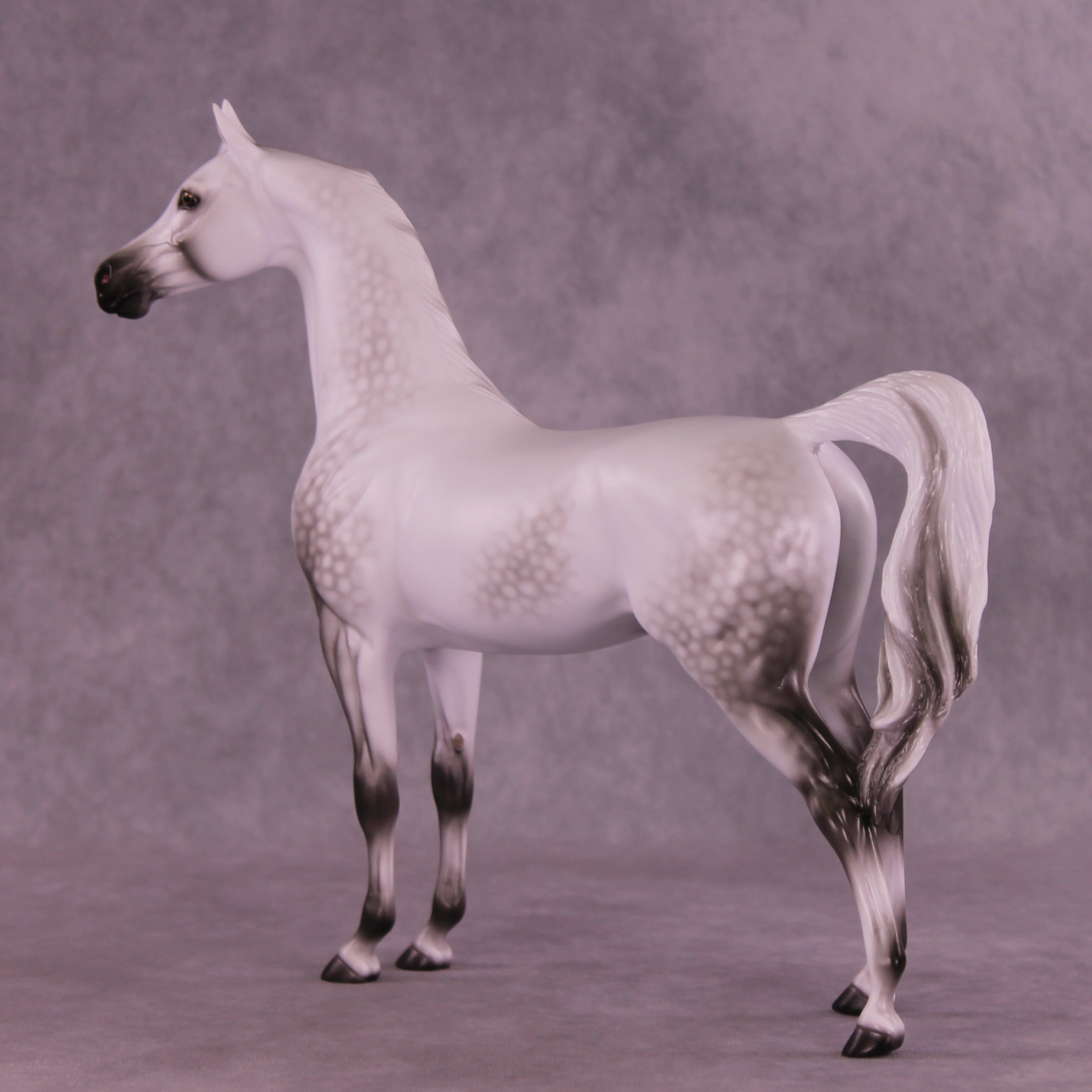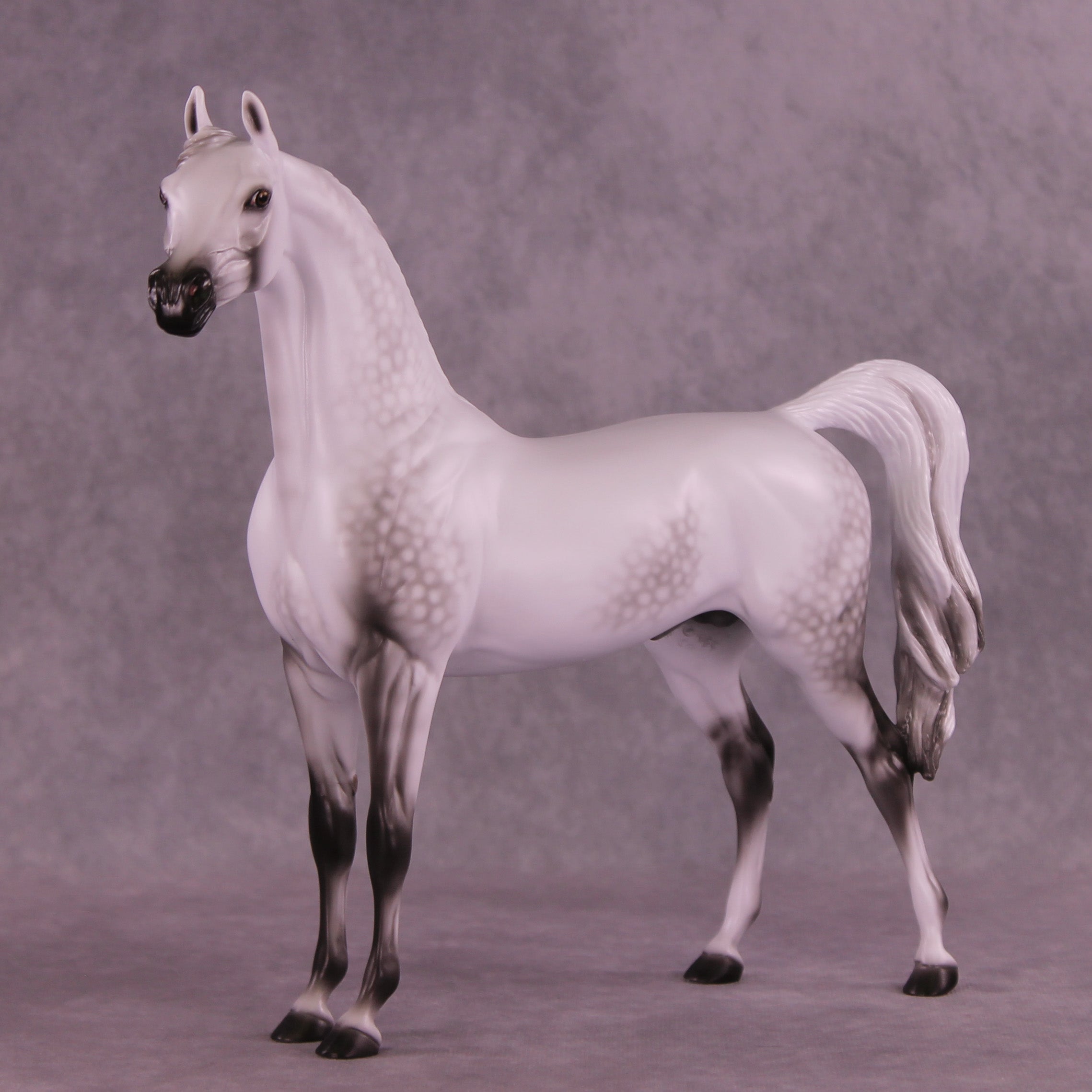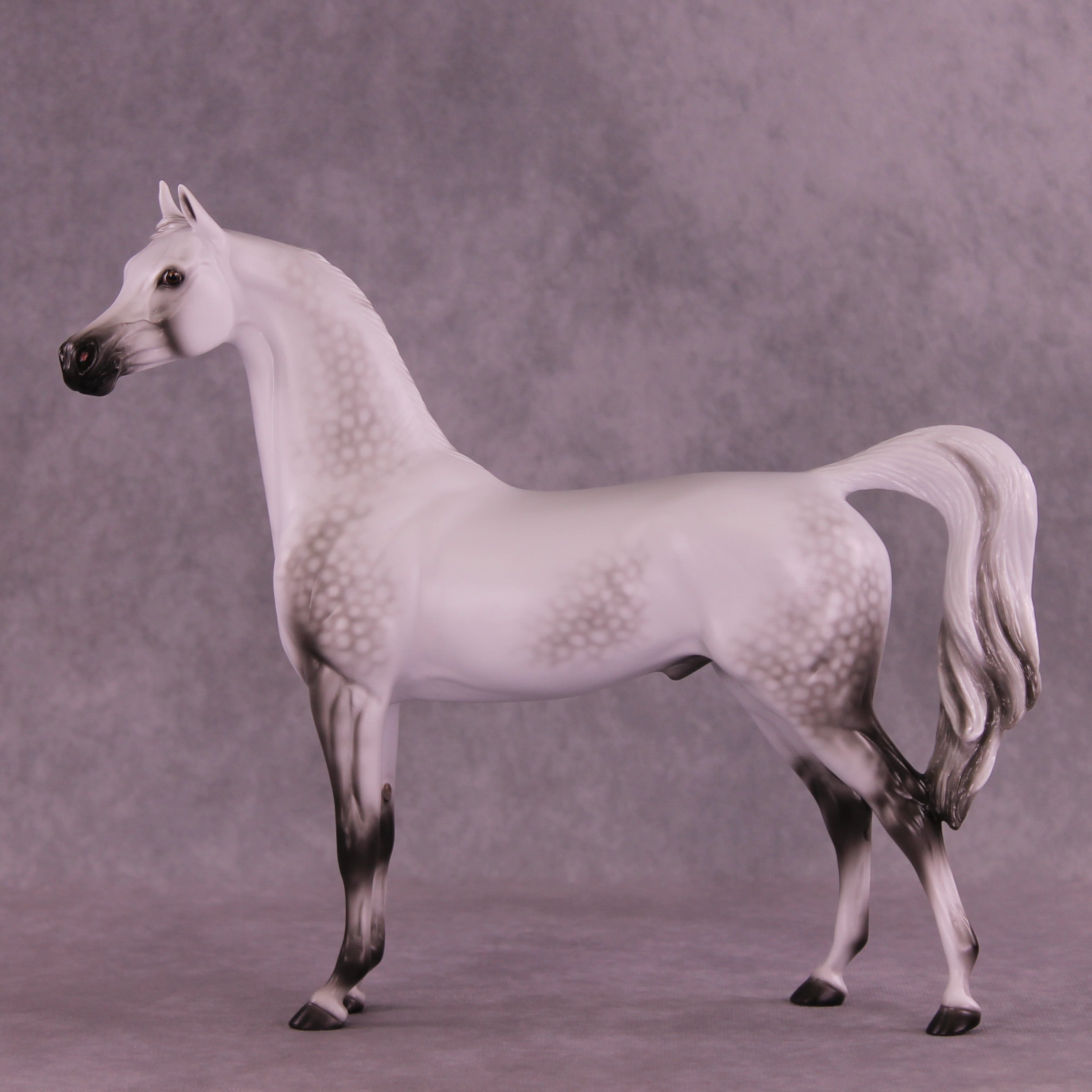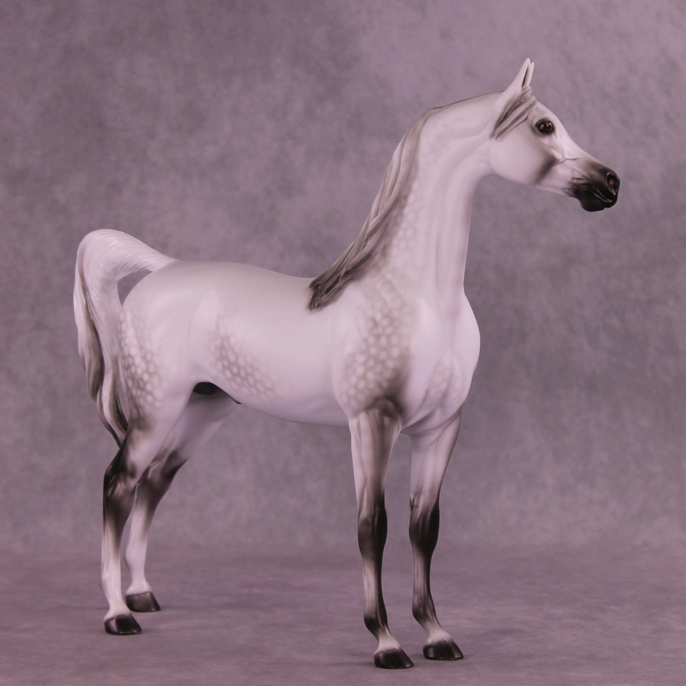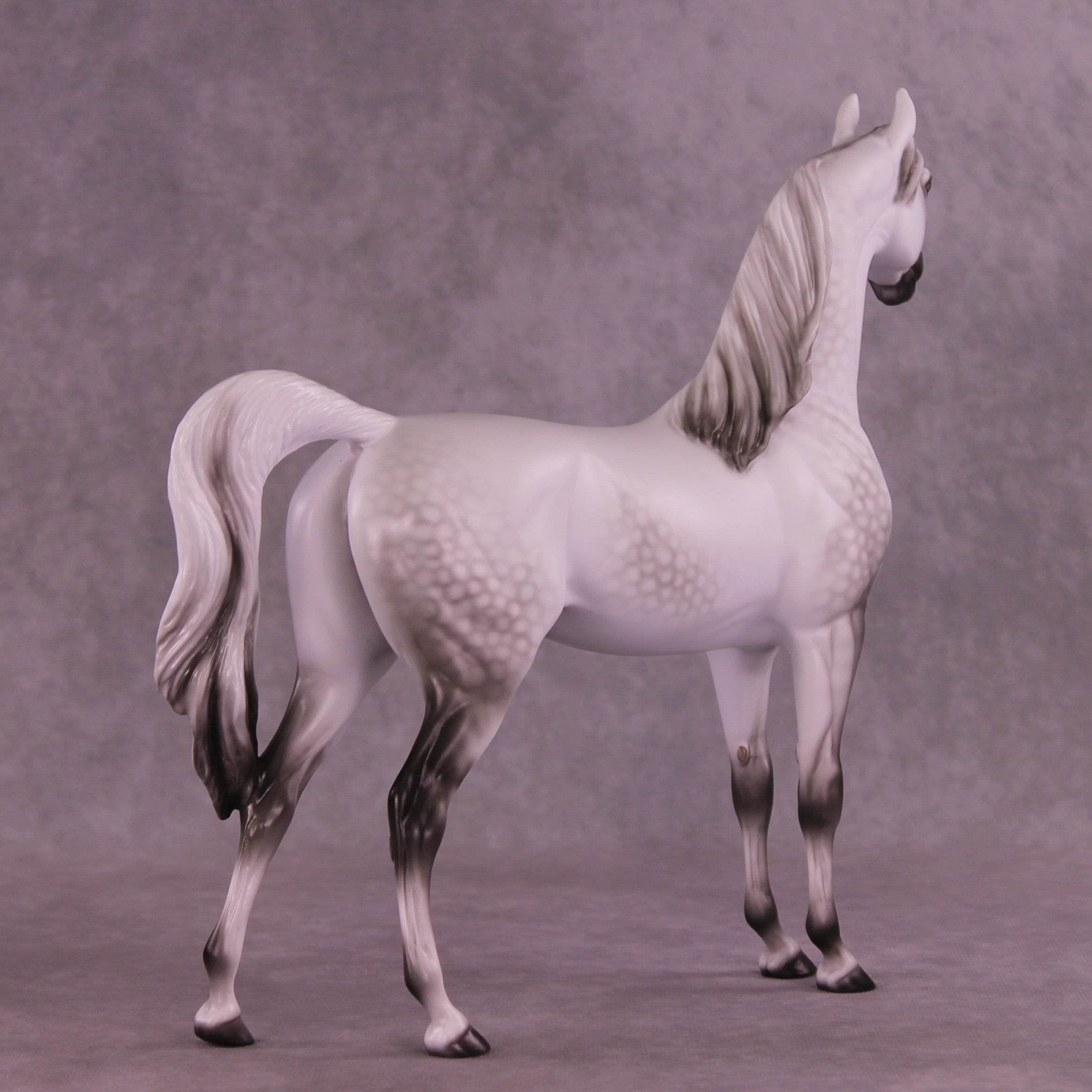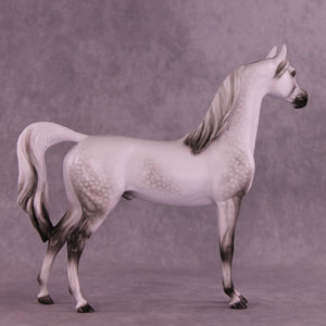 Please meet Mini Artem! Our 1:9 scale Arabian Stallion painted in a deliciously detailed dapple grey by Ellen Robbins. Her dappling and delicate shading skills are unreal, and she displays her craft front and center on this release. He is a run of 60 pieces with all finish options available.