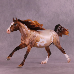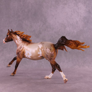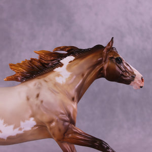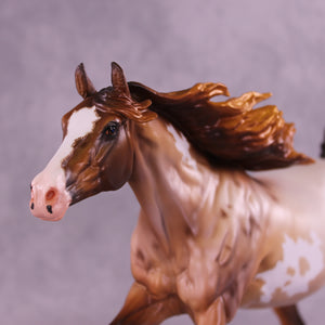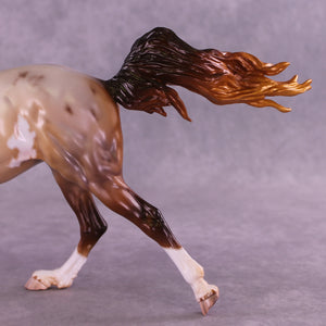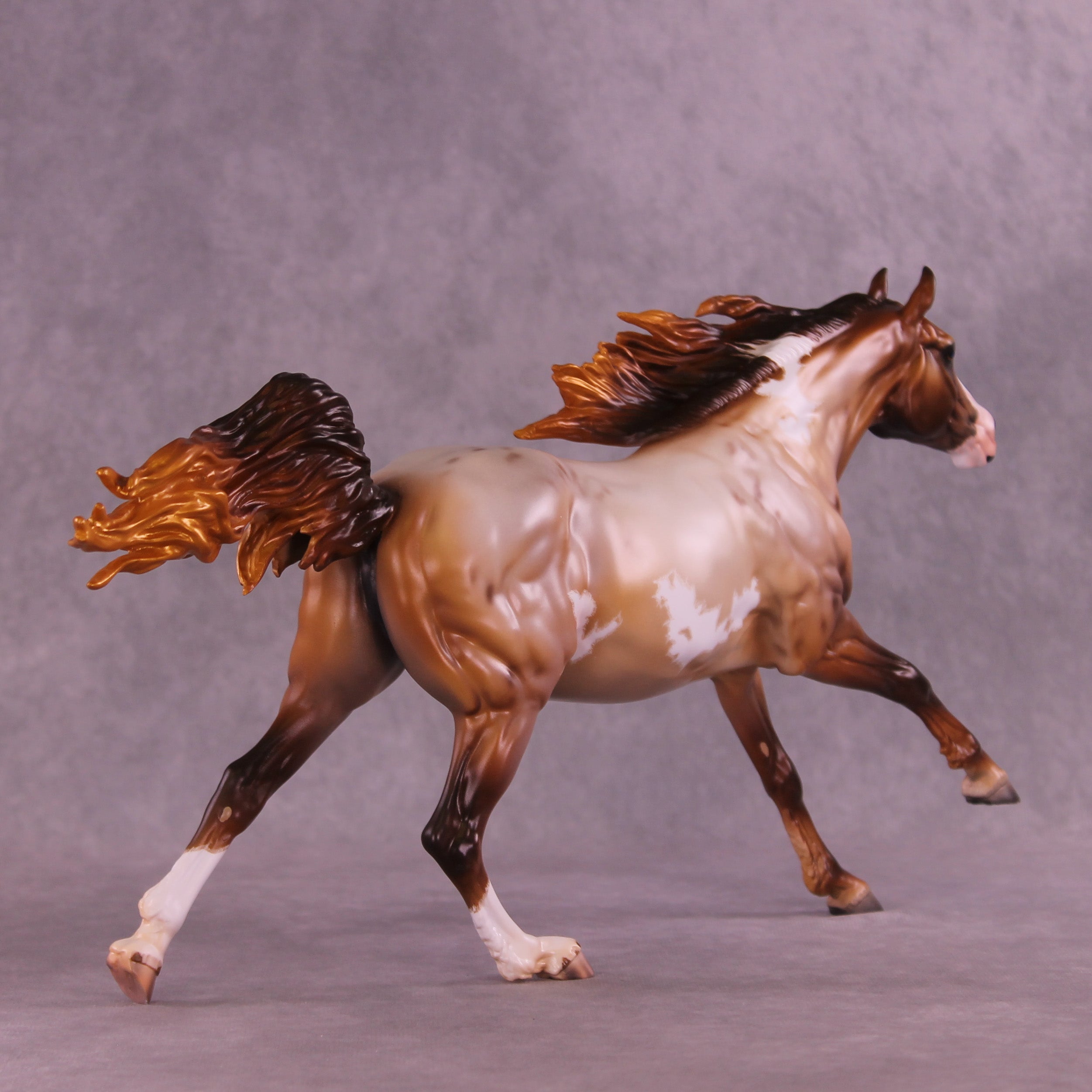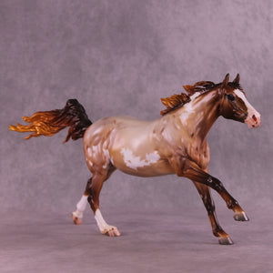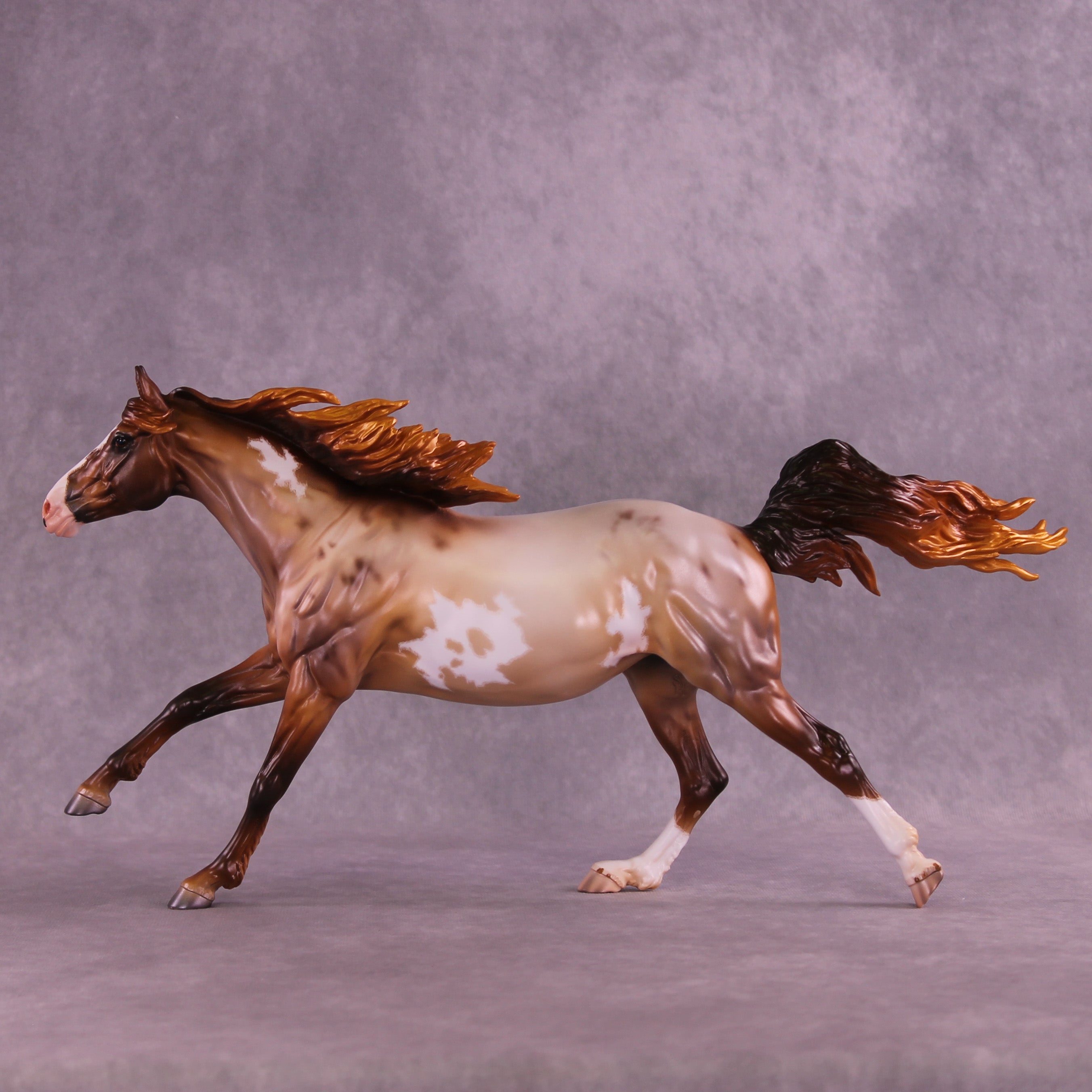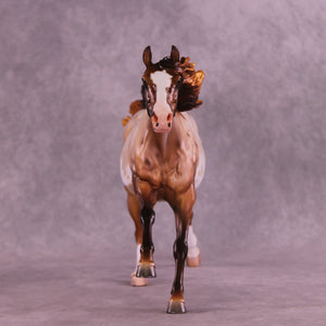 This piece has FIRE. Melanie gave her a gorgeously detailed customized long flying mane, uplifted tail, and forelock with extra tendril detailing, with both fuzzy ears pricked forward attentively. Caroline Boydston painted her to a stunning red roan overo pinto with etched marking edges, corn spotting, striped hooves, stunning dimensional shading, metallic coppery highlights in her mane and tail, hand-painted eyes, and more! She GLOWS, and she is available in all finish options.