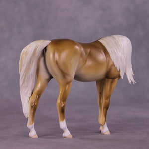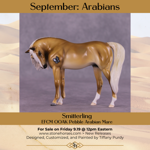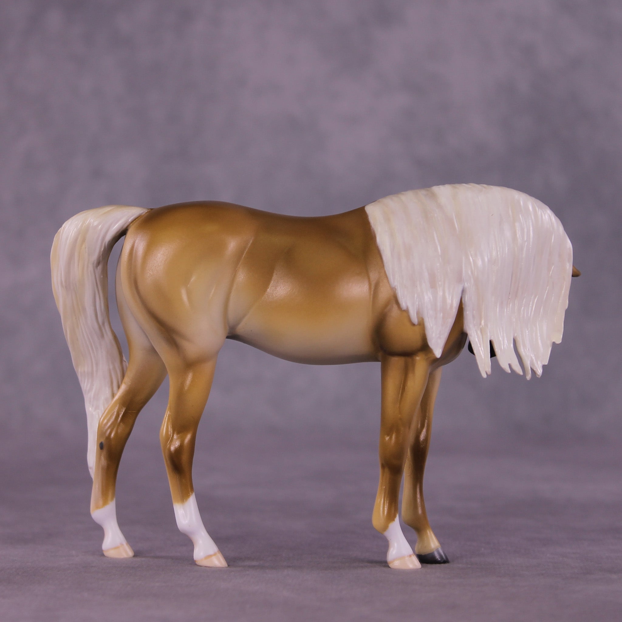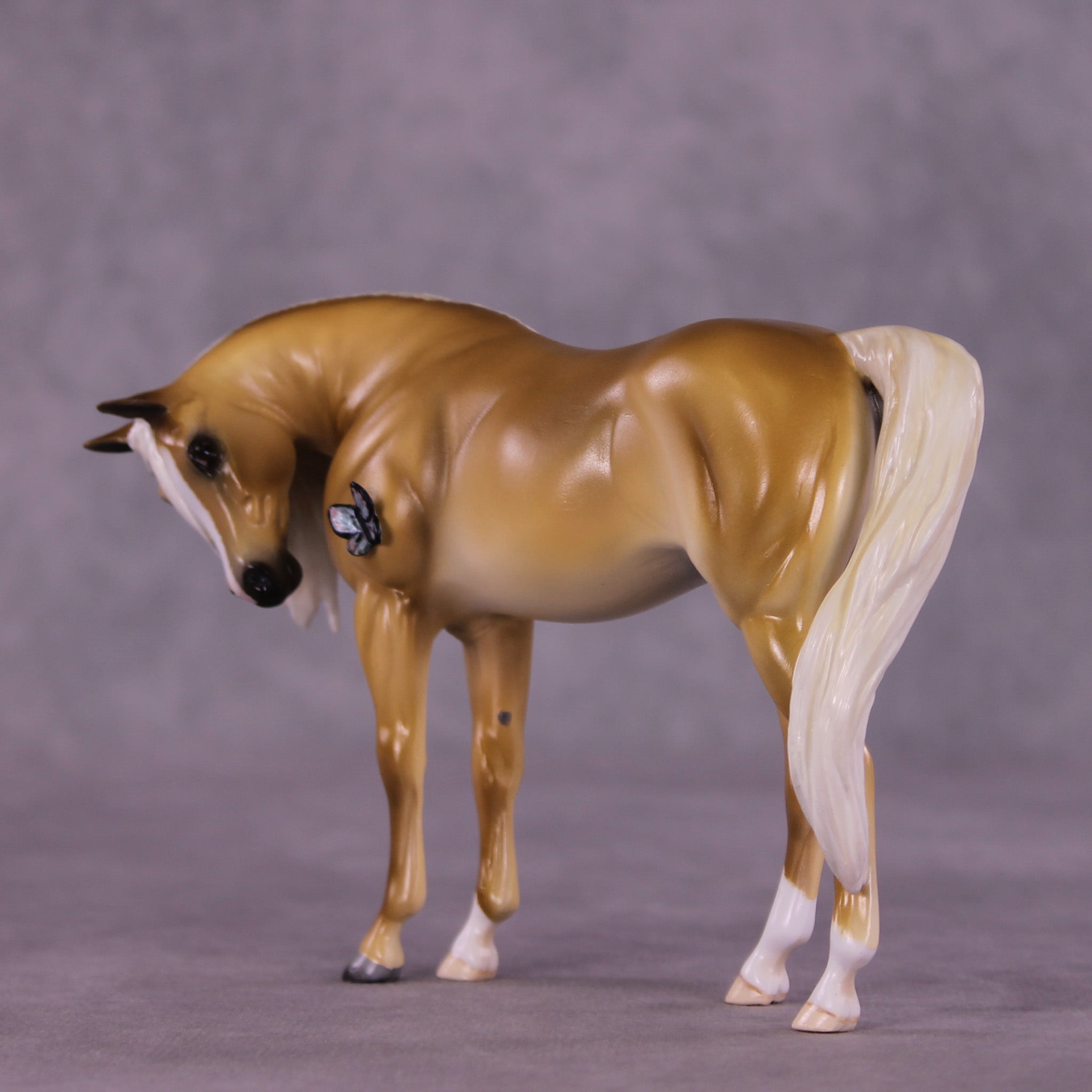 Smitterling is our Pebble Arabian Mare with a sweet new look – she has a dramatically turned head and neck position to be checking out a butterfly that has landed on her shoulder. She has an extra long and detailed new mane and tail as well, and is finished to one of Tiffany’s trademark shaded palominos. She is just lovely!