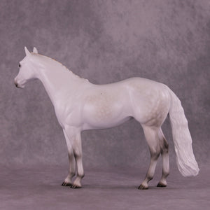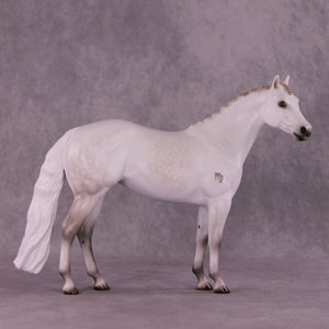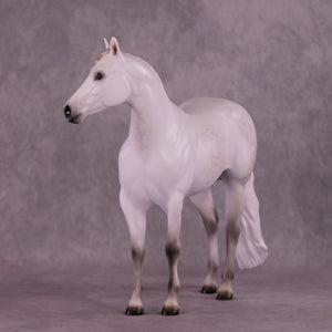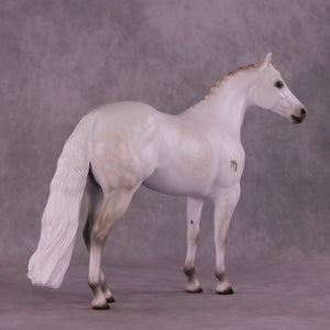 Spica, the realistic version, is a prim and proper basecoated chalky dapple grey, with subtle fleabites, lightning marks on her hind gaskins, and loads of refined details. Ashley’s finishwork designs are never one dimensional and this mare is a perfect example! She is a limited edition of 10 pieces, and available in all finish options. You also get to choose if you want the Virgo brand or not!
