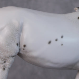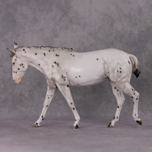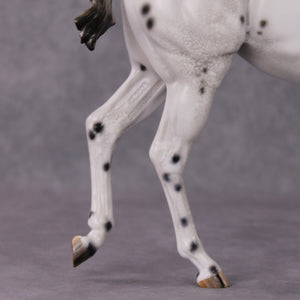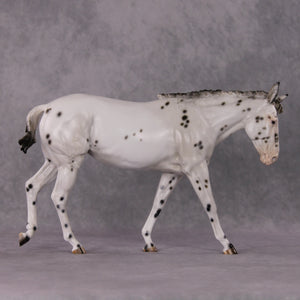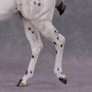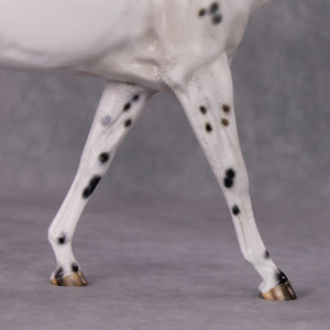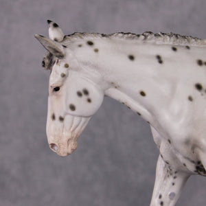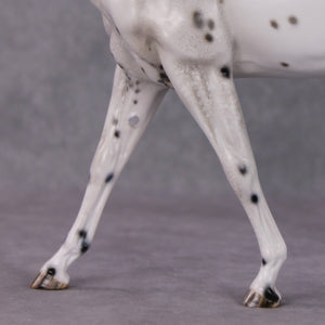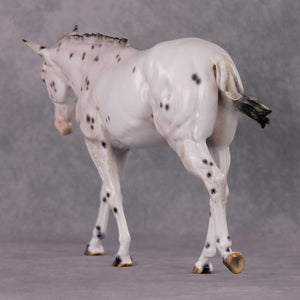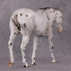 Tiffany gave this large mule an adorable scruffy rat tail, shortened mane, and customized listening ears along with a subtle head tilt to create a mule that, for those who show, will stand out in halter, performance, or both! Not to mention her dramatically detailed black leopard appaloosa paint job with shading, mottling, hoof stripes, and all the bells and whistles. For those who don't show, this piece is truly unique in her balance of appy-tude and sweetness.