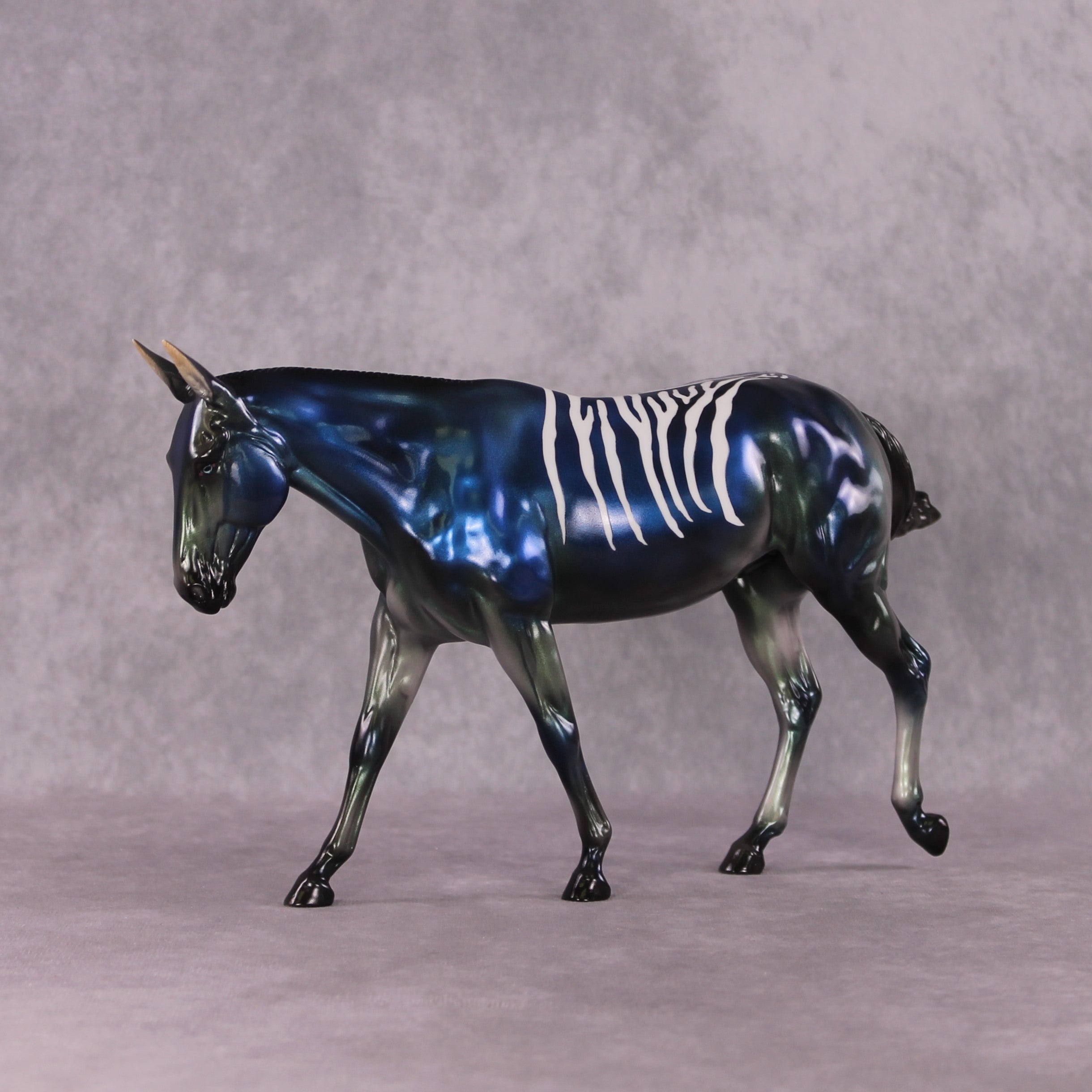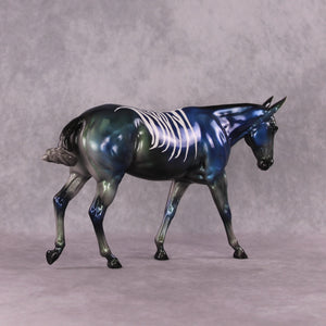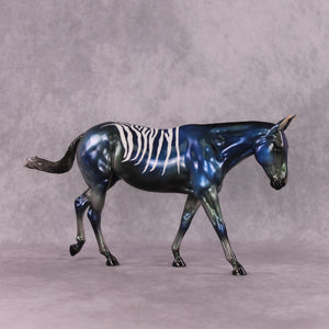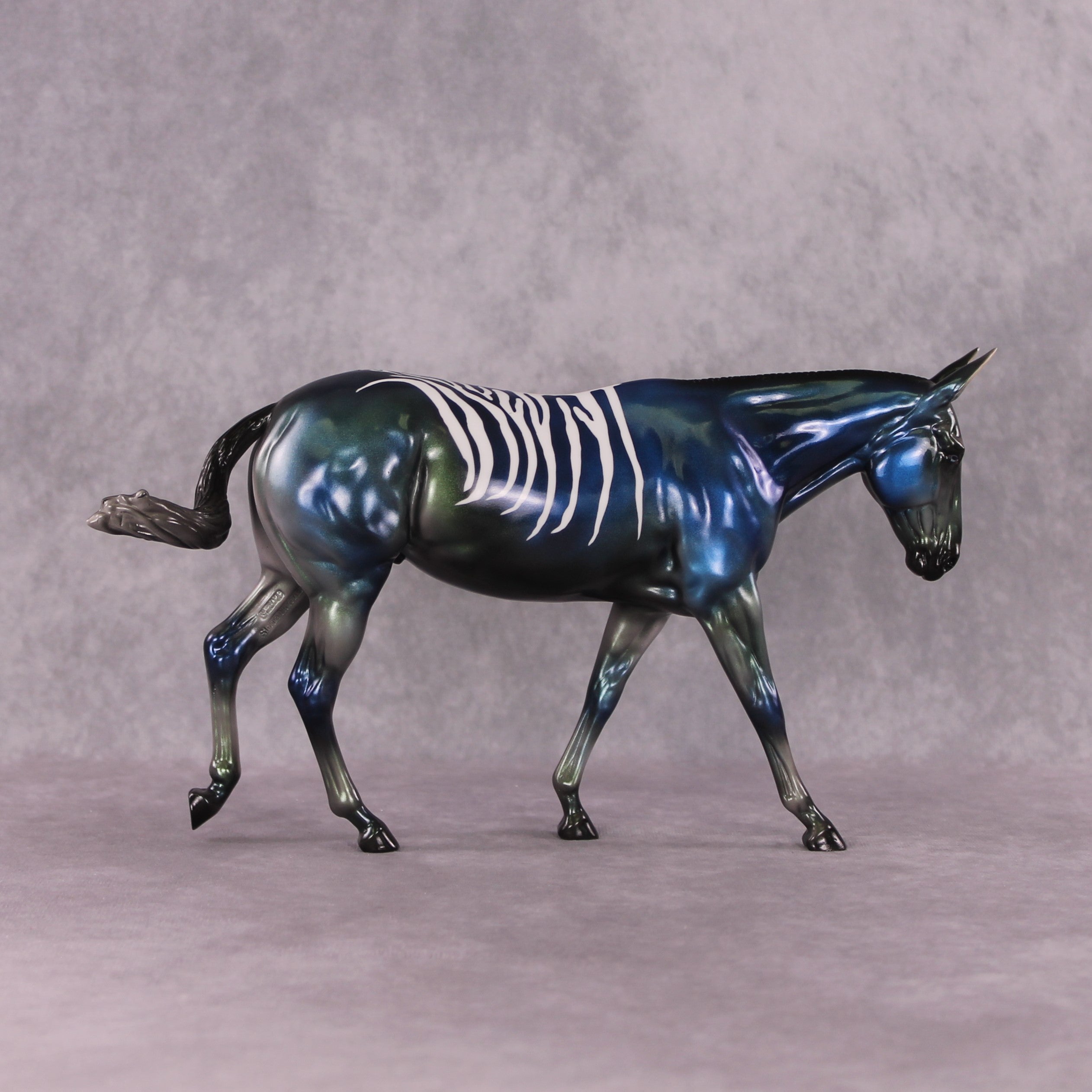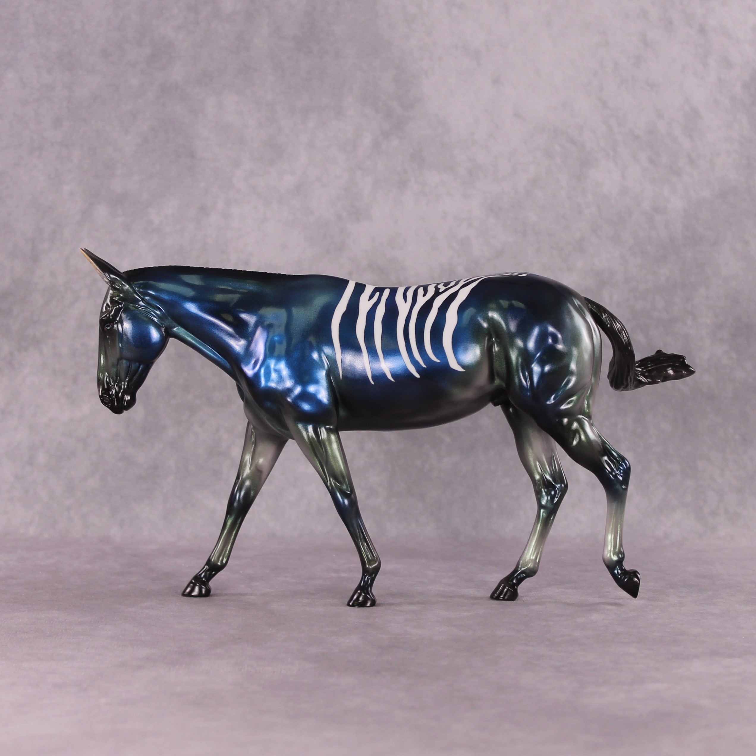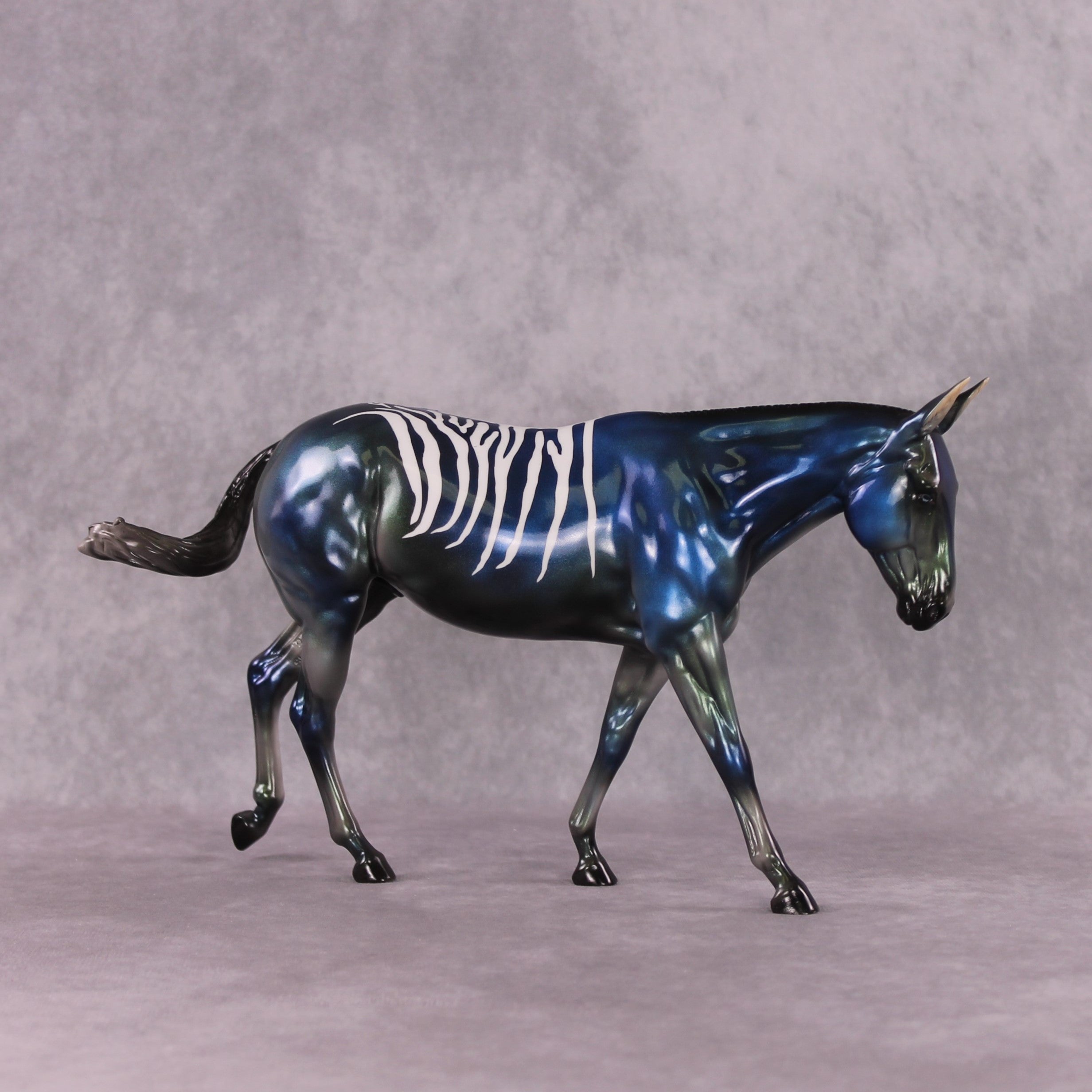 “Squiggle” is a super unique striped decorator design on our large mule, customized to a gelding and featuring a customized swishing tail. Tegan created a super dimensional metallic shaded blue and grey look, featuring pearl white stripes to really set him apart from the crowd.