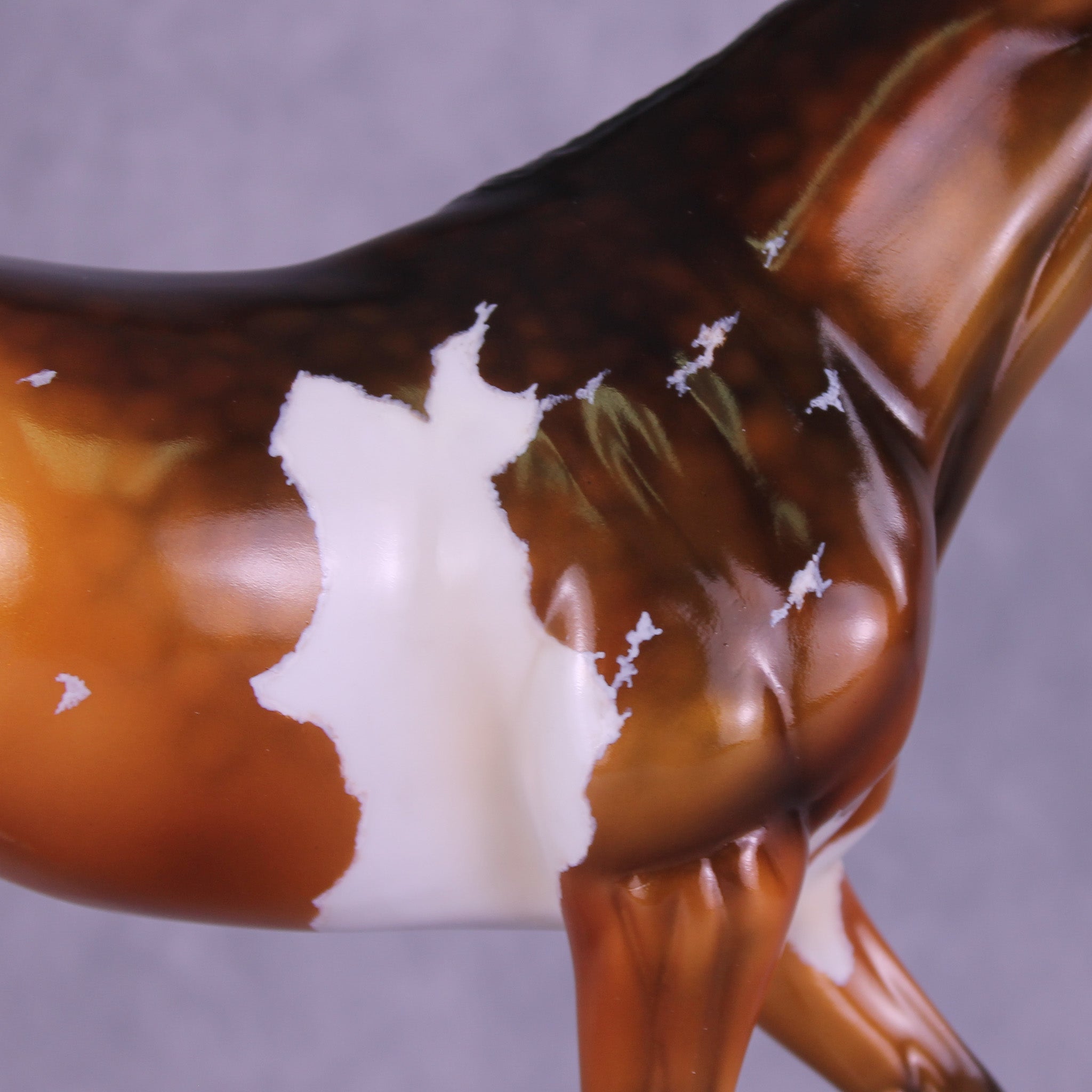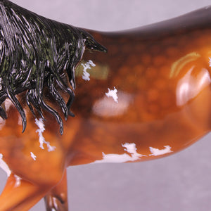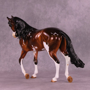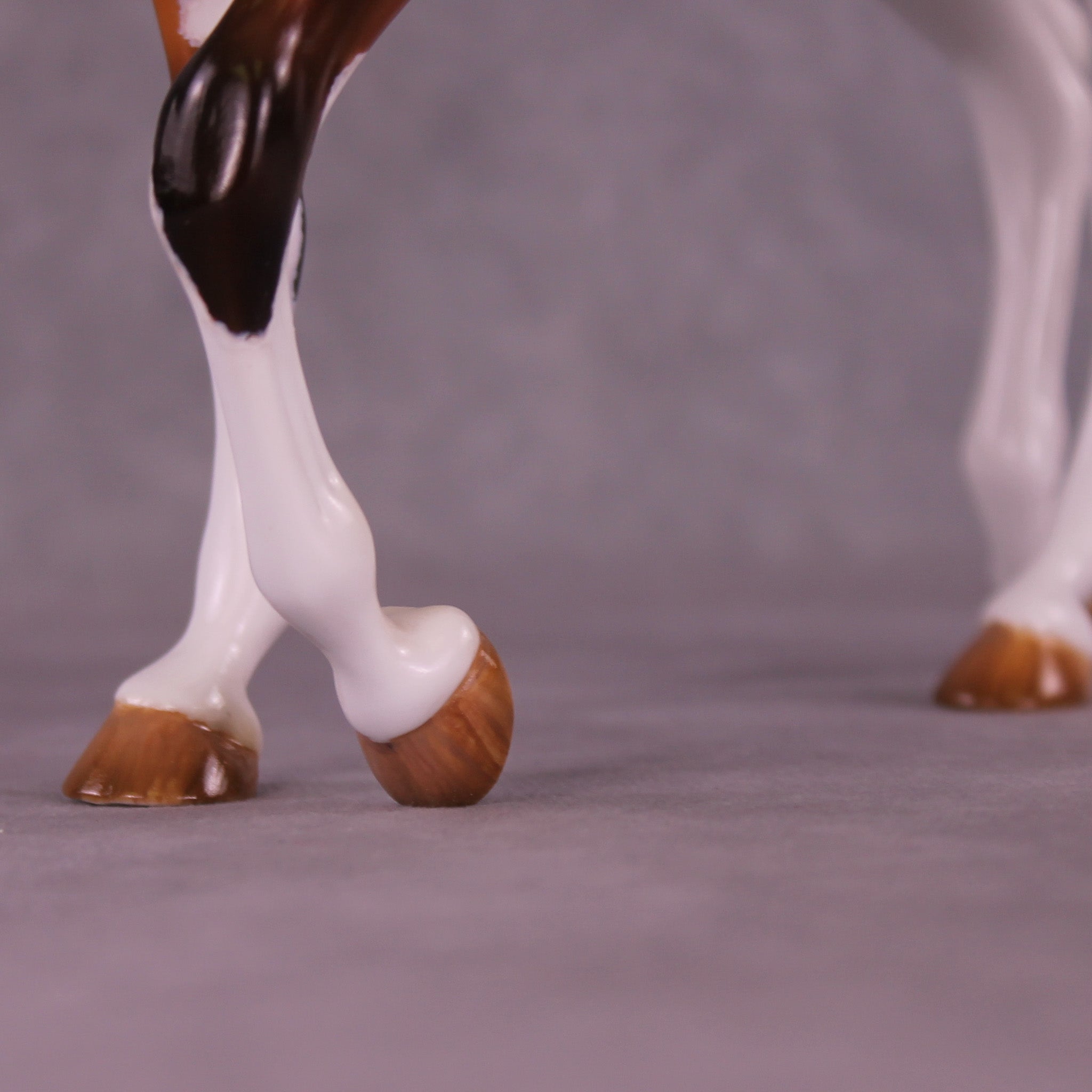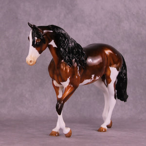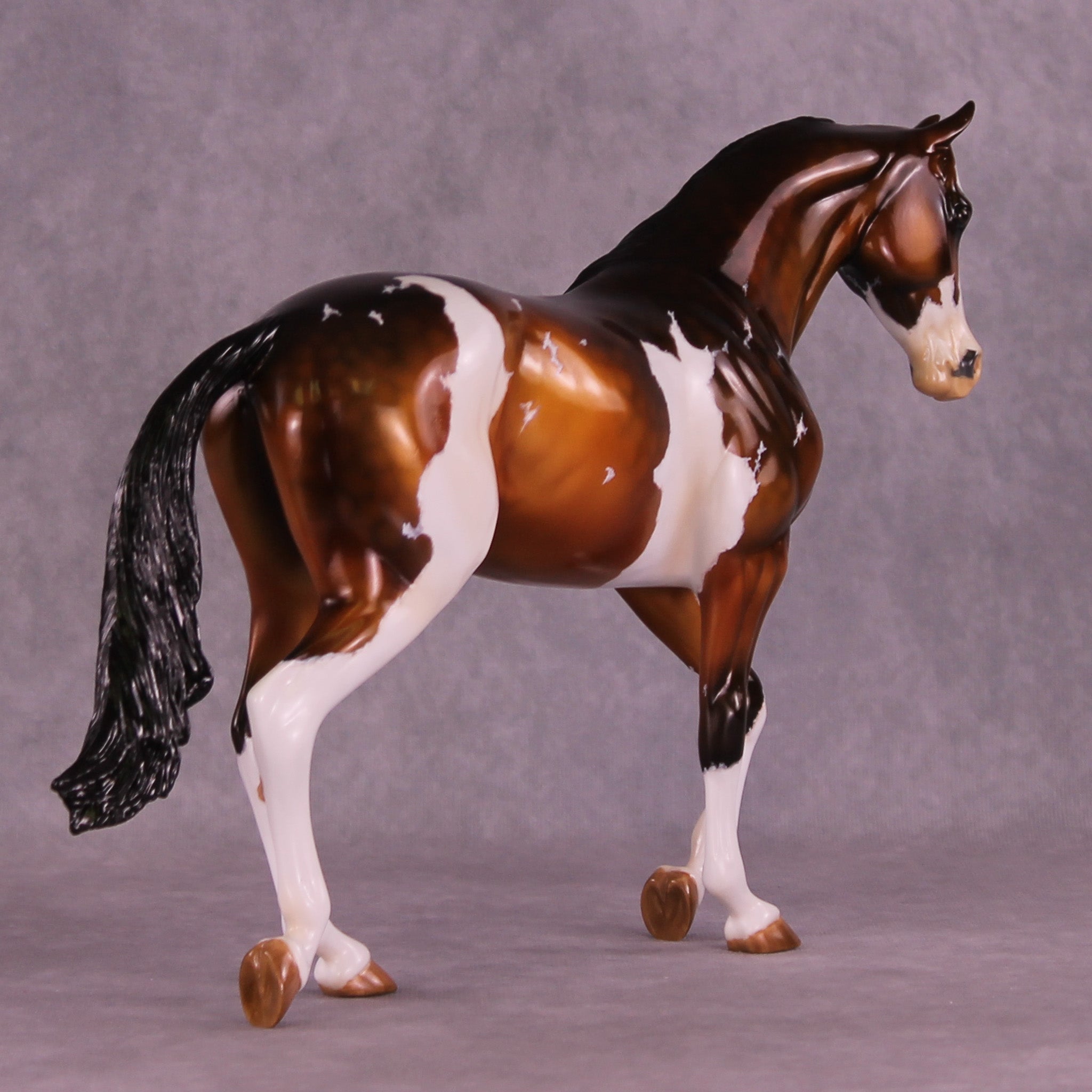 This gorgeous guy is a very special Mona piece! She took our Thoroughbred and gave him a customized slightly turned head and neck, and then a whole new mane and tail with extra tendril detailing in her signature style. Kristen painted him to a stunning dappled bay pinto with tons of hand painted mapping and etched detailing, shaded whites, hand painted hooves, and then he is finished in a lovely high gloss. Performance or Halter, he’s ready for anything.