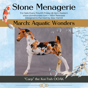 In this month's Menagerie, explore the beauty of aquatic themes with our Koi-inspired pebble model horses. Each piece, crafted with Jess Hamill's artistic touch, features intricate fish scale details and a variety of Koi color options, capturing the elegance of these magnificent creatures. Dive into this enchanting collection with us!