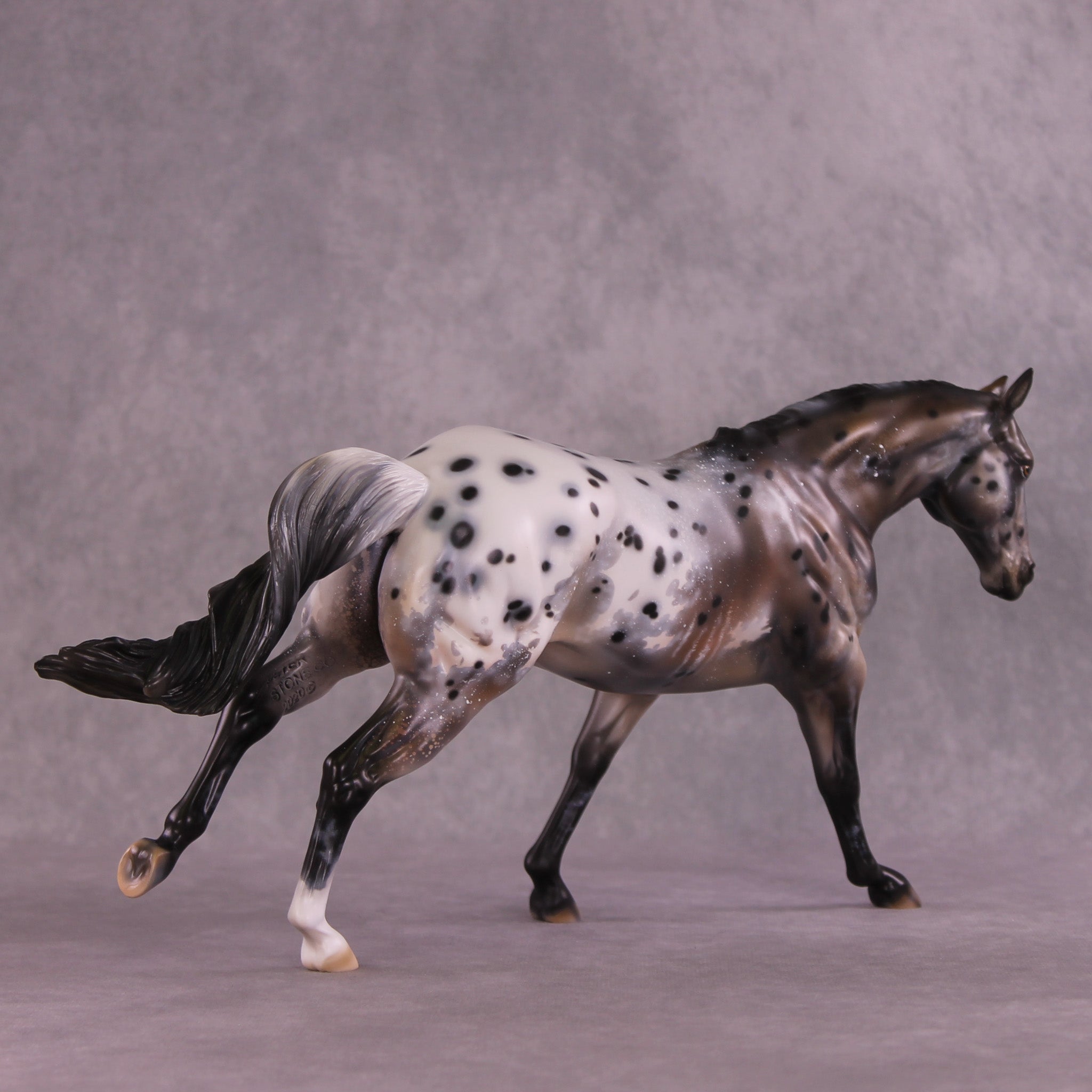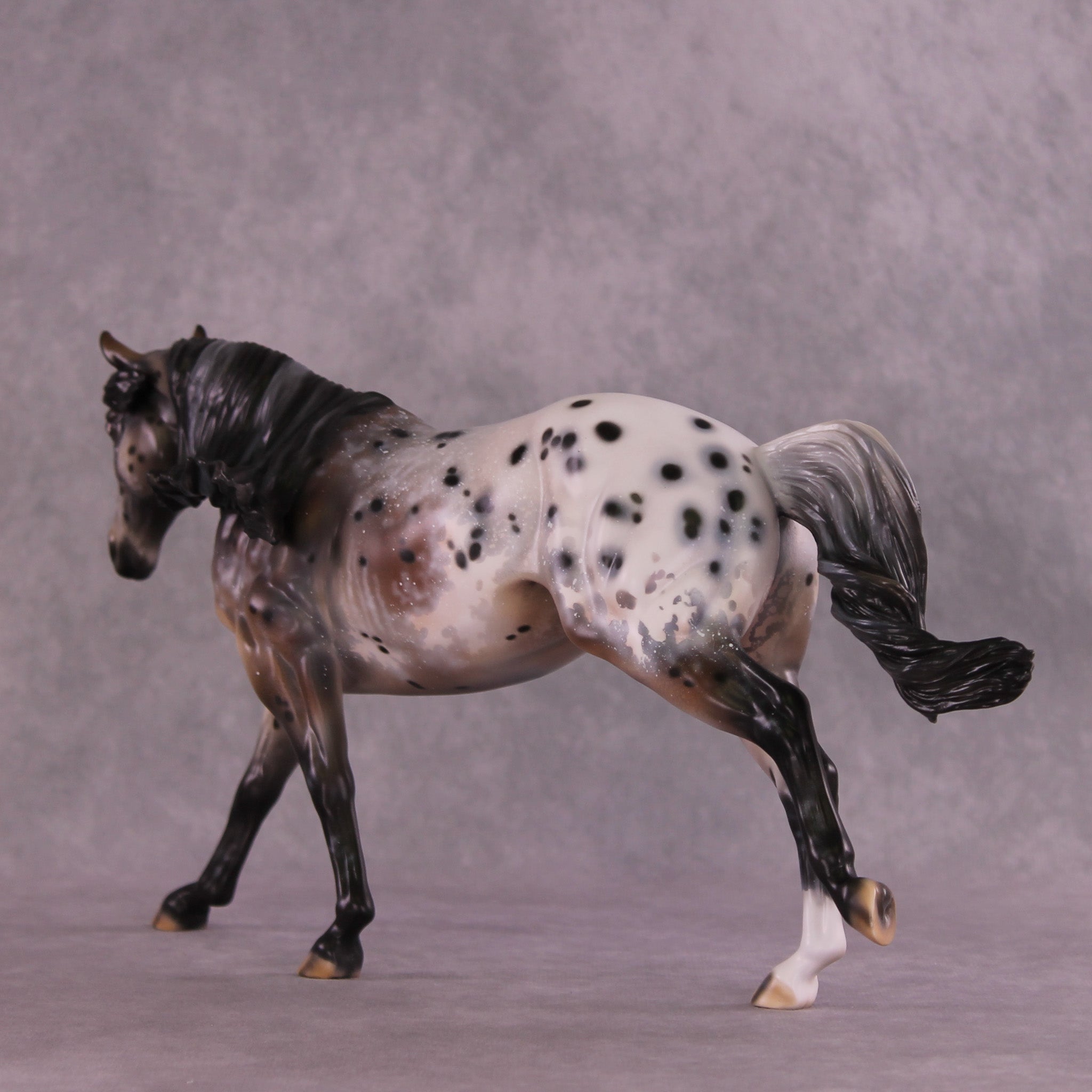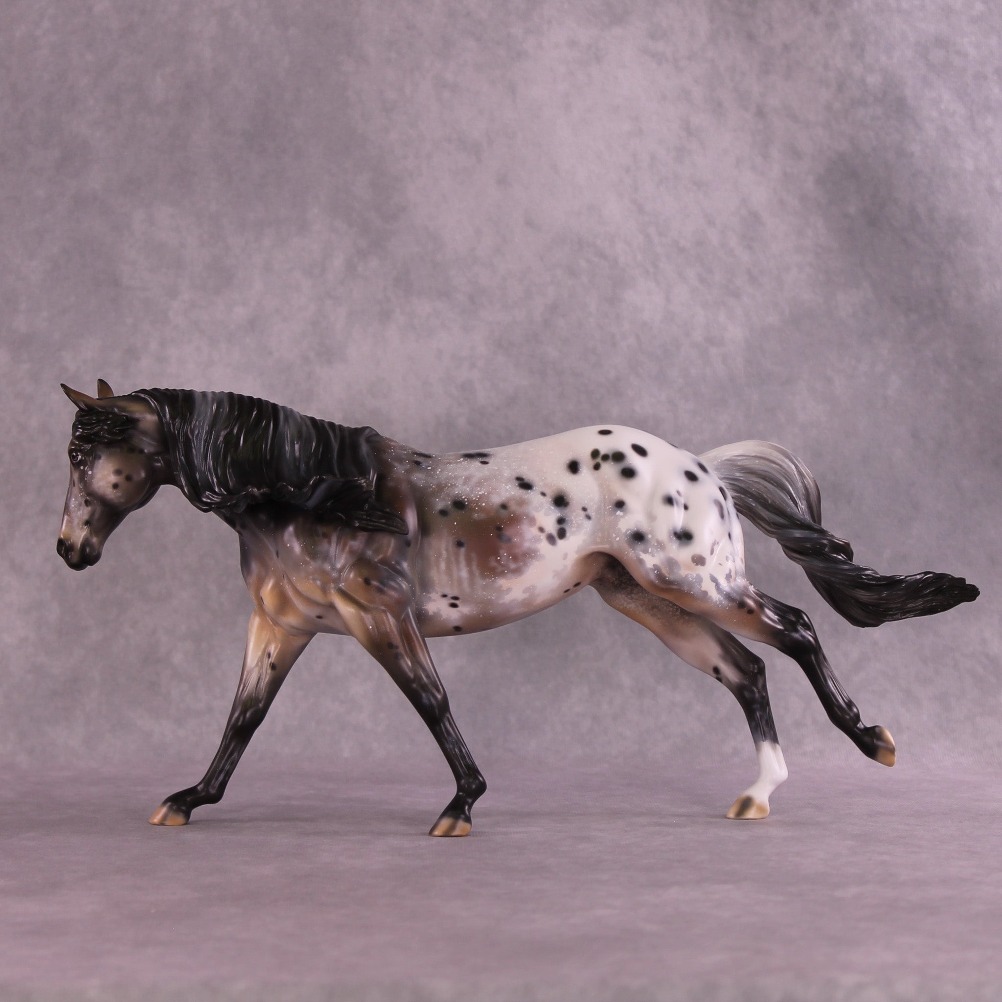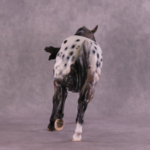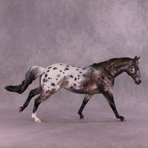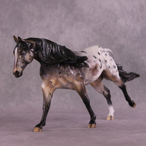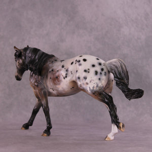 Stone Soup is a gorgeous example of our Remington mold, with his long mane and forelock plus an extra customized tail by Matt, twisting in the breeze from his forward lope. Mindy painted him to a deliciously detailed bay appaloosa with tons of spot haloing, rib ticking, hoof stripes, mottling, and more!