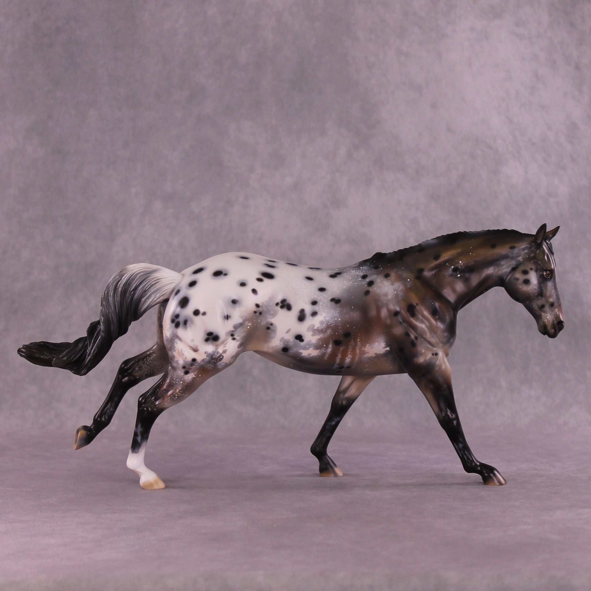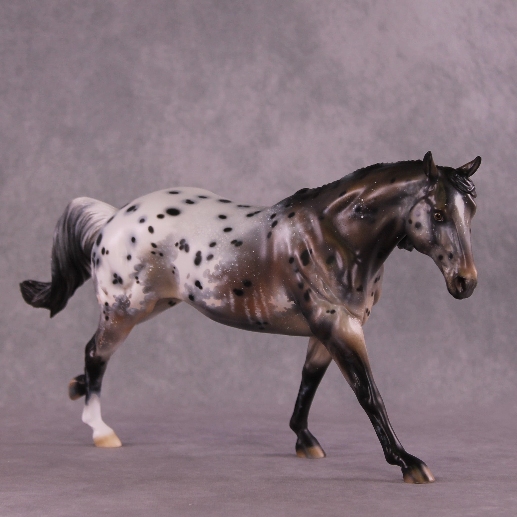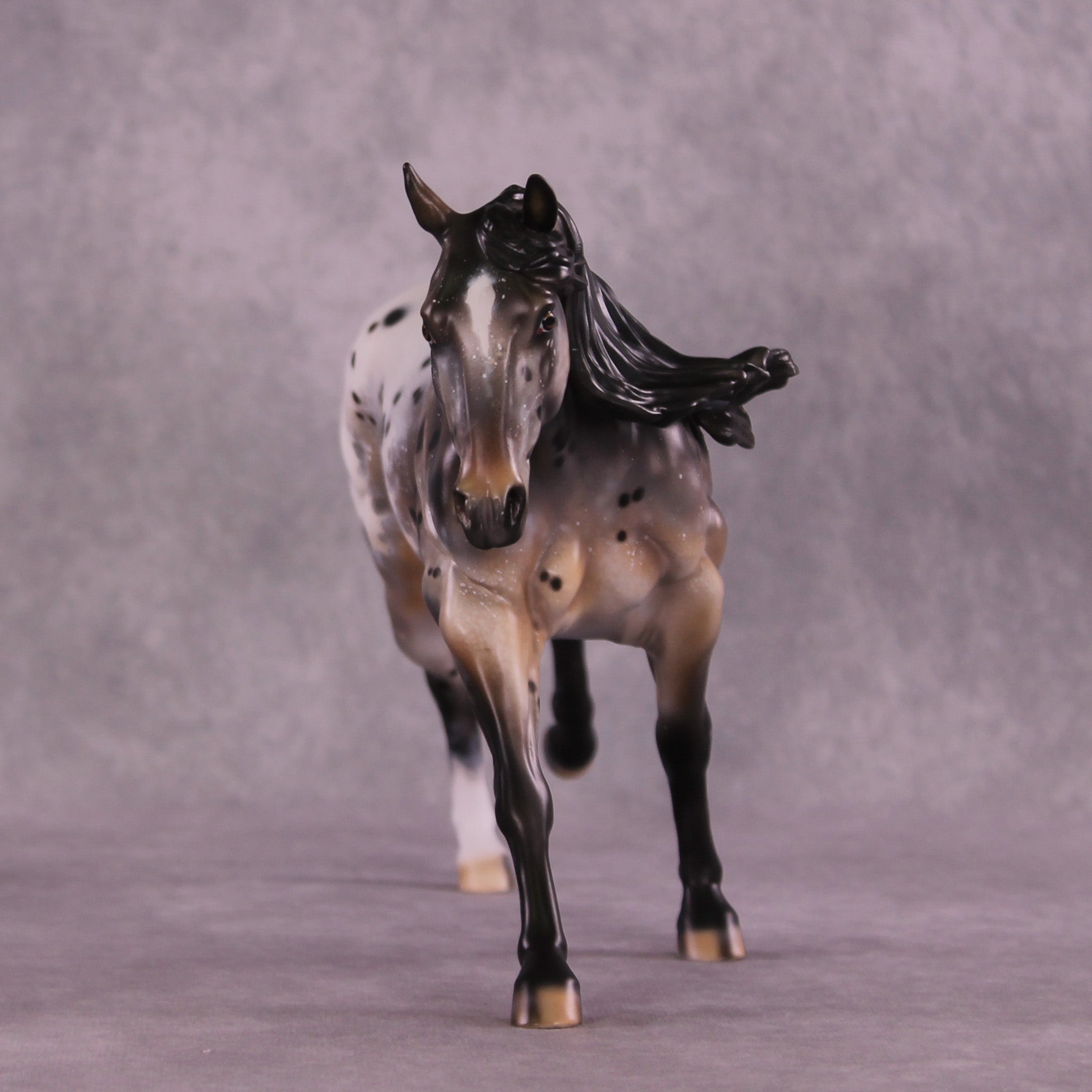 Stone Soup is a gorgeous example of our Remington mold, with his long mane and forelock plus an extra customized tail by Matt, twisting in the breeze from his forward lope. Mindy painted him to a deliciously detailed bay appaloosa with tons of spot haloing, rib ticking, hoof stripes, mottling, and more!