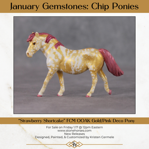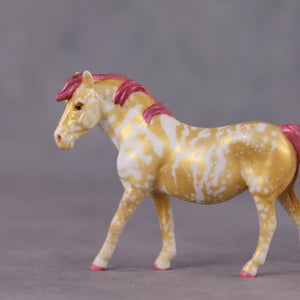 “Strawberry Shortcake” nearly stayed here, being my favorite colors – pink and gold! She features a turned head and swishing tail, topped with a super detailed splatter dapple gold paint job trimmed by a shaded iridescent pink mane, tail, forelock, and hooves. She is currently satin matte and extra finish is available on this piece.