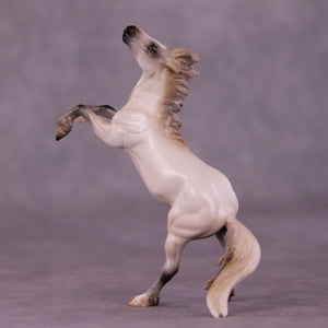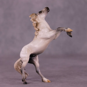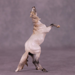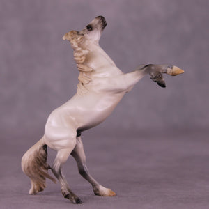 Sugar on Snow begins with our Chip Rearing Horse, given a drastic makeover by Maggie Jenner-Bennett. She lifted and tossed his head and neck with added volume in his neck and mane to really bring out the wild mustang proportions. He has repositioned front legs and added tendril volume in his tail as well! Mindy Berg painted him to a stunningly shaded light grey with wild horse shading in his mane, tail, and legs. He really looks wild, and will stand out in any mustang class! No finish changes are offered on this piece.