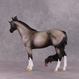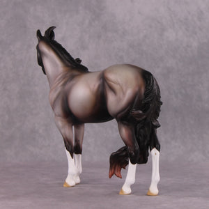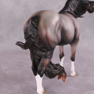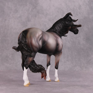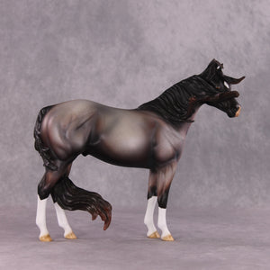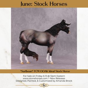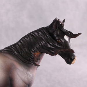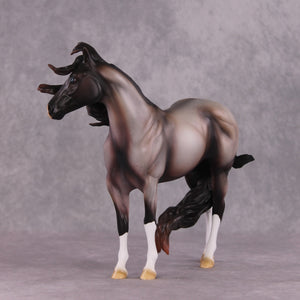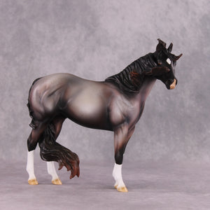 “Surfboart” really does look fresh from the beach. Amanda gave him extra facial detailing and a dramatic blowing mane and forelock, with his tail blowing between his hind legs with loads of tendril detailing across the board (…boart). She then painted him to a gorgeous dark bay roan with TONS of dramatic shading and four white socks, a star, and a snip!