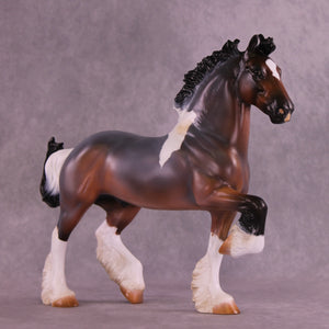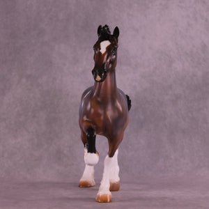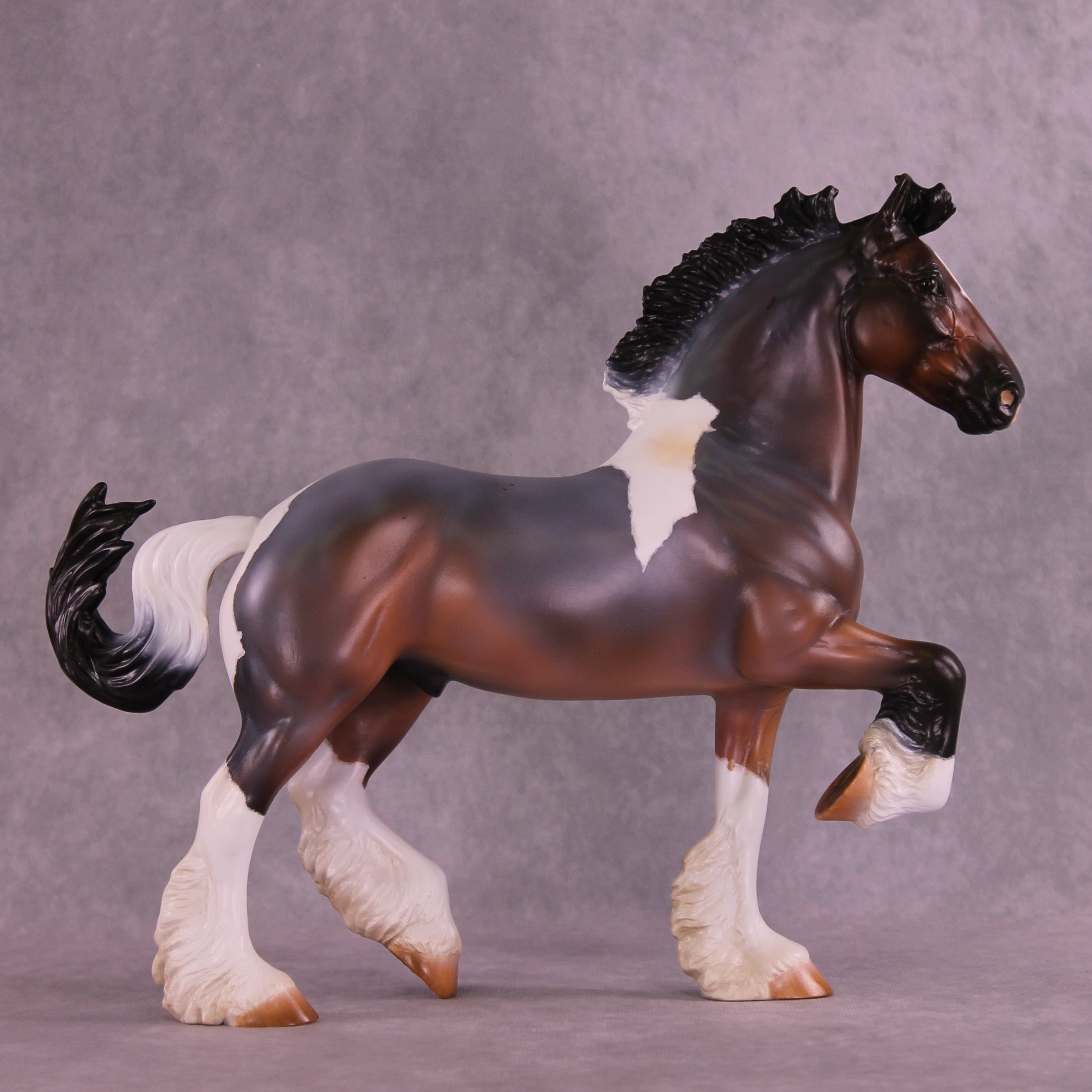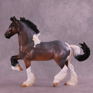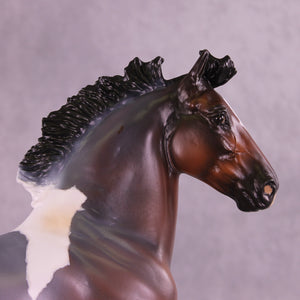 Swanson begins on our Trotting Drafter, and Kristen gave him a subtle customized turned head, a short flying mane, and action packed twirling tail. He is painted to a gorgeous dapper dark bay roan tobiano pinto with corn spotting, shaded whites, shaded feather, and more! He comes in a soft satin matte with no finish changes offered on this piece.