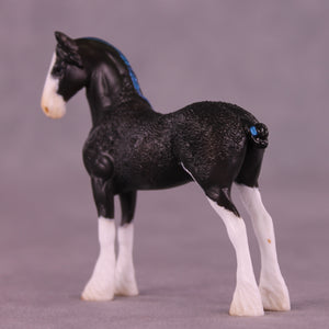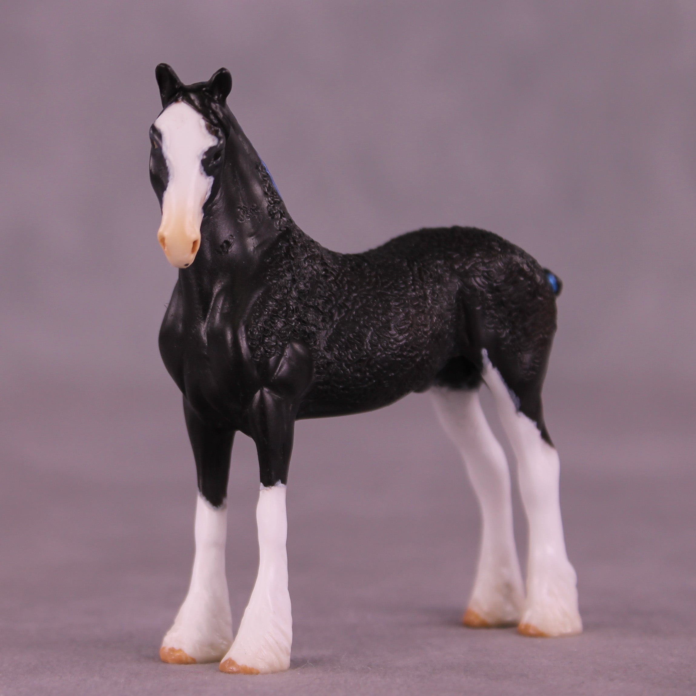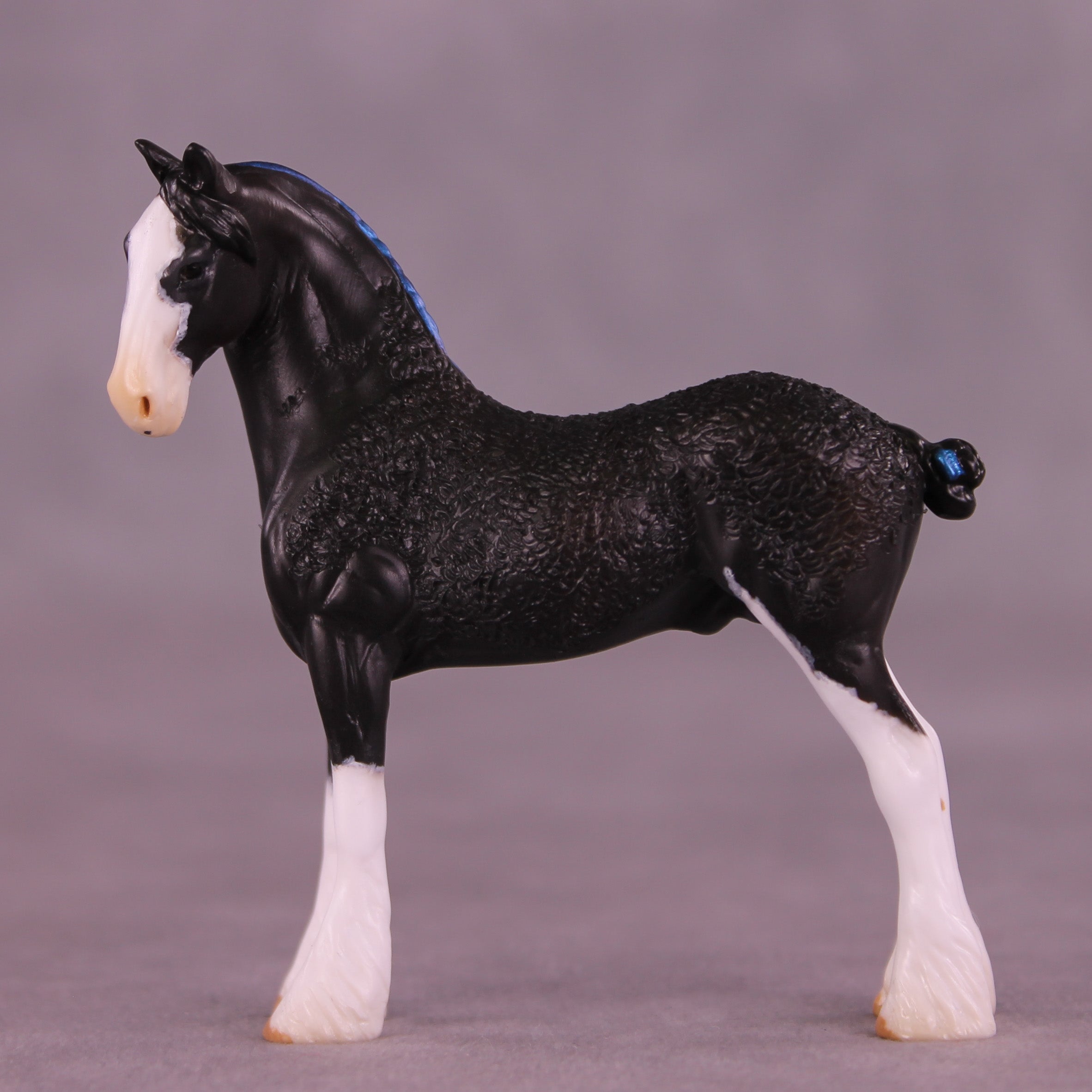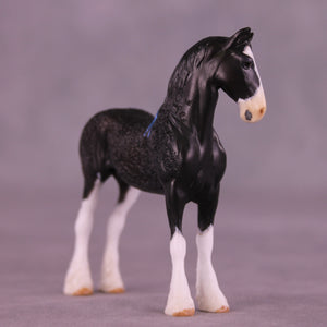 Now who is this sweet gentleman? Kristen took our Chip Drafter and gave him an adorably tucked and turned customized head and neck position, and then did extensive re-working on his whole body to represent the show Draft ‘soaping’ technique! She did a marvelous job and this gentleman looks fresh from a draft horse show ring. He is painted to a lovely shaded black with high shaded white socks, a wide blaze, and coordinating blue ribbons in his mane and tail. He comes in matte finish and no finish changes are offered on this piece.