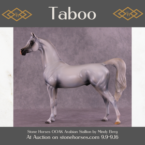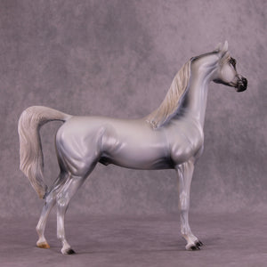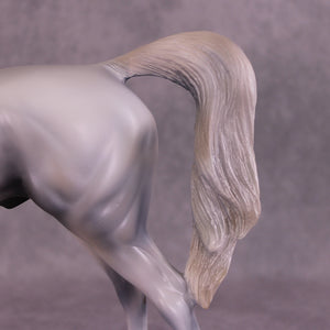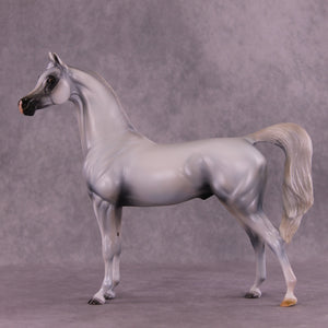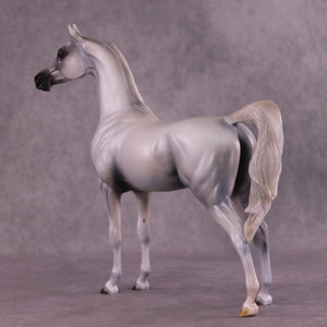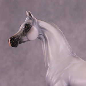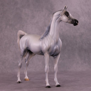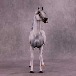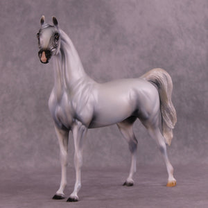 Taboo is a striking grey by Mindy Berg. Starting with the Arabian Stallion sculpture, she gave him a dimensional grey coat with deep shading around the muzzle. One hind sock and a charming face marking add extra appeal to this beautiful model. What’s more iconic than a white grey arabian stallion? Not much!