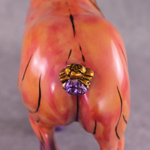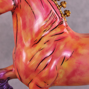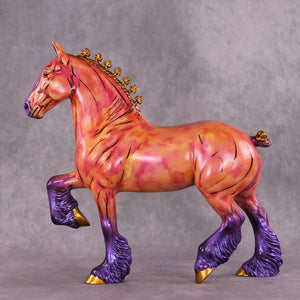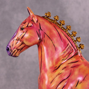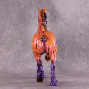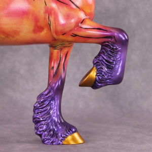 Mel Miller's "Tahiti Marvel" is a vibrant spectacle of color and motion. By seamlessly integrating comic book-style art onto the equine canvas, Miller masterfully evokes a sense of nostalgia and storytelling. This trotting drafter appears as if it has galloped straight from the pages of a beloved comic book. The vivid hues of bright pink, yellow, and purple, accented with touches of gold, perfectly capture the playful essence of comic art, making the piece both eye-catching and memorable.