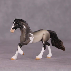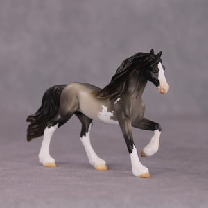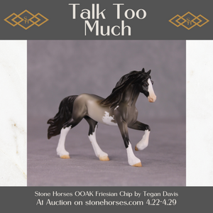 “Talk Too Much” is a lovely soft shaded grulla sabino painted by Tegan Davis on our Friesian Chip mold. He has nose pinking, shell shaded hooves, and gorgeous details throughout.