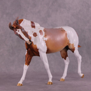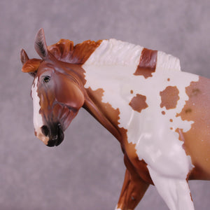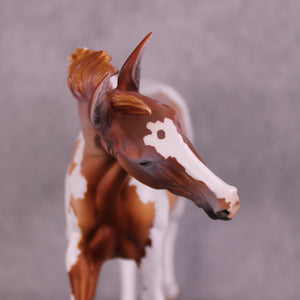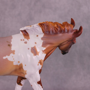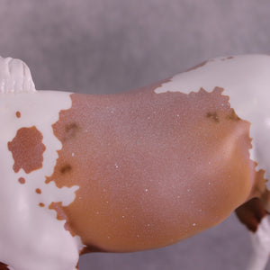 “Terracotta” is a throwback to 2024’s popular “Sprinkles” customization from the Country Fair, featuring an animated shaking head and mid-shake floppy ears, along with a mane and tail that move along with the dynamic action of this piece. Dawn painted her to a gorgeously detailed red roan pinto with corn spotting, roaning, hoof stripes, and more.