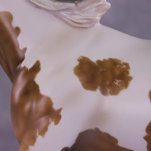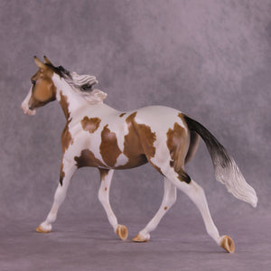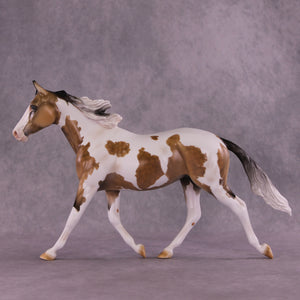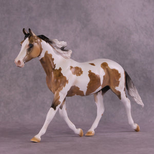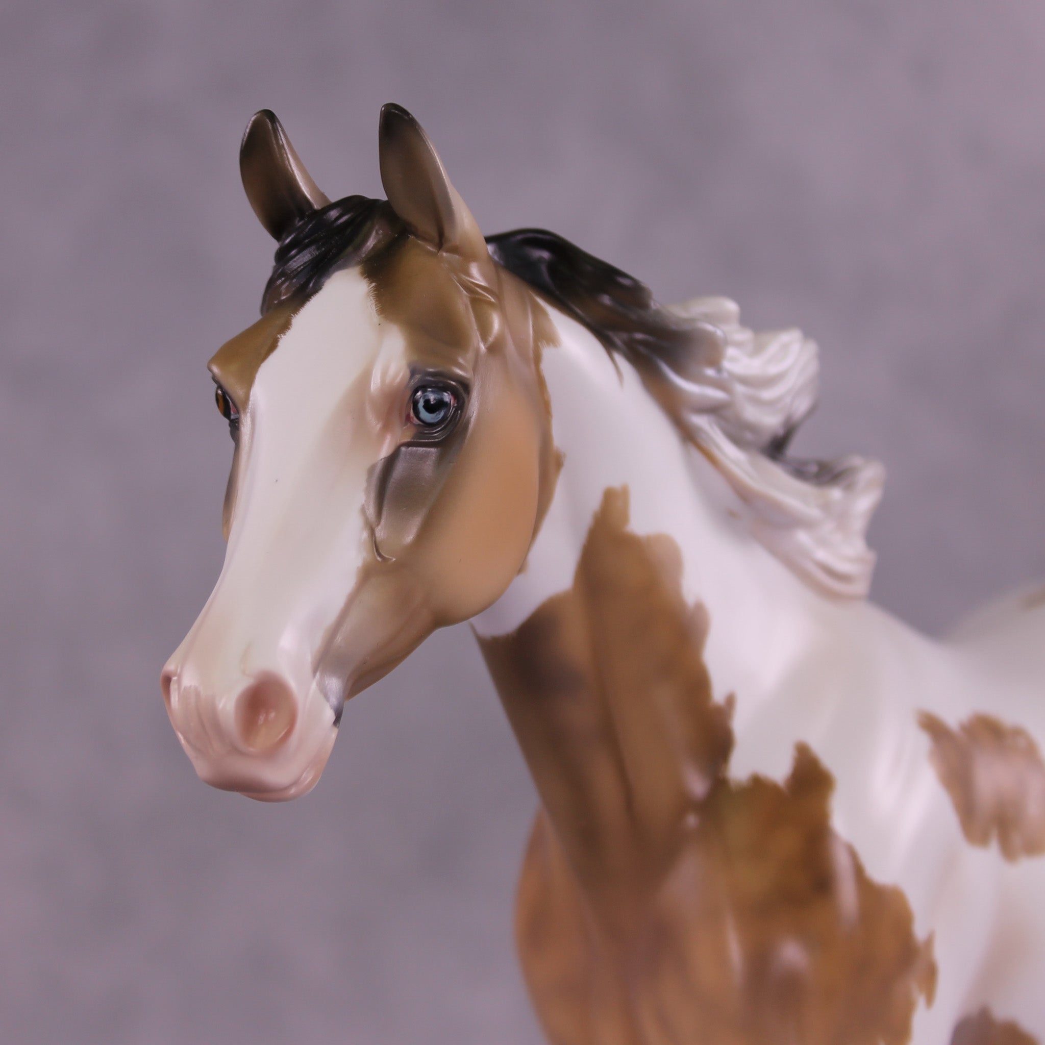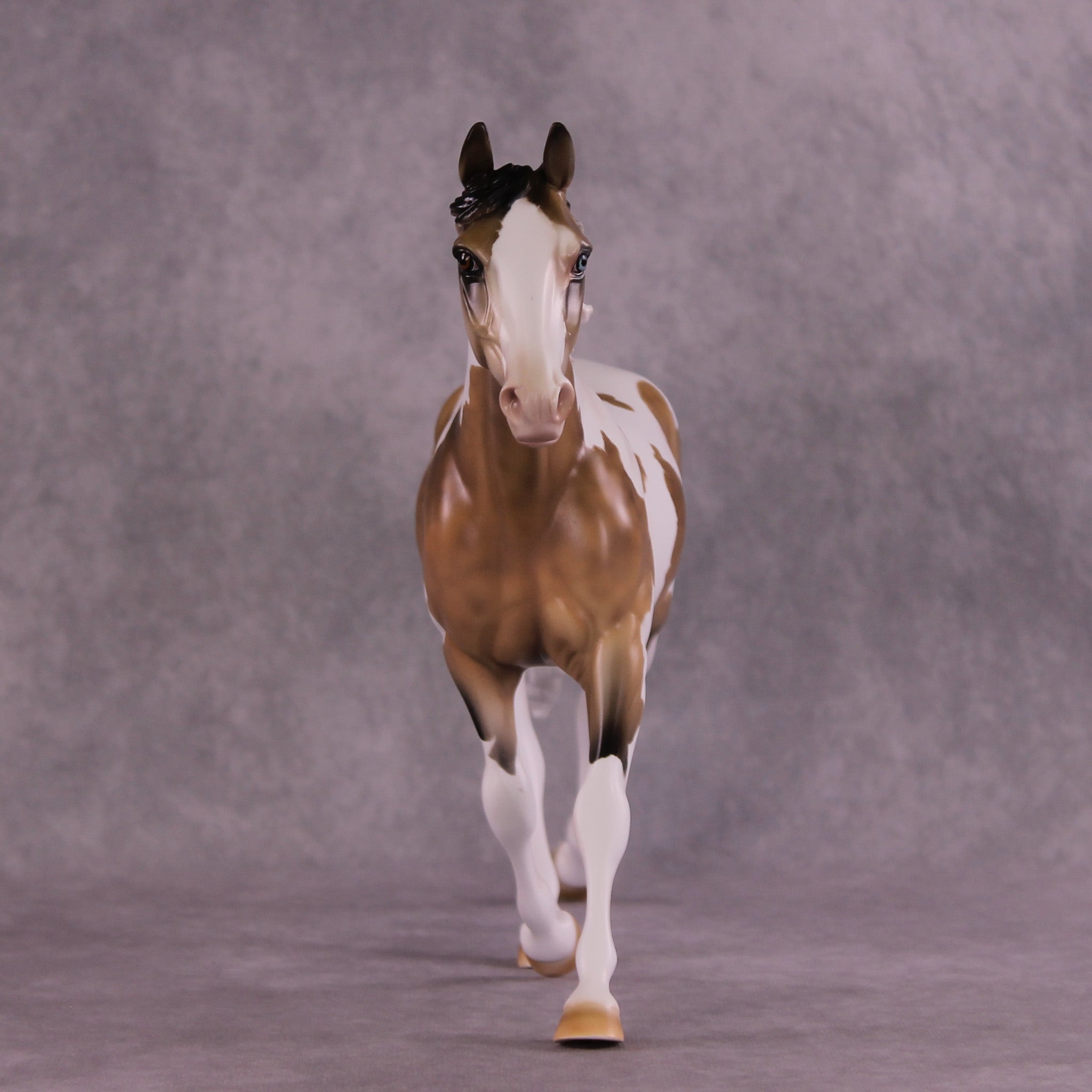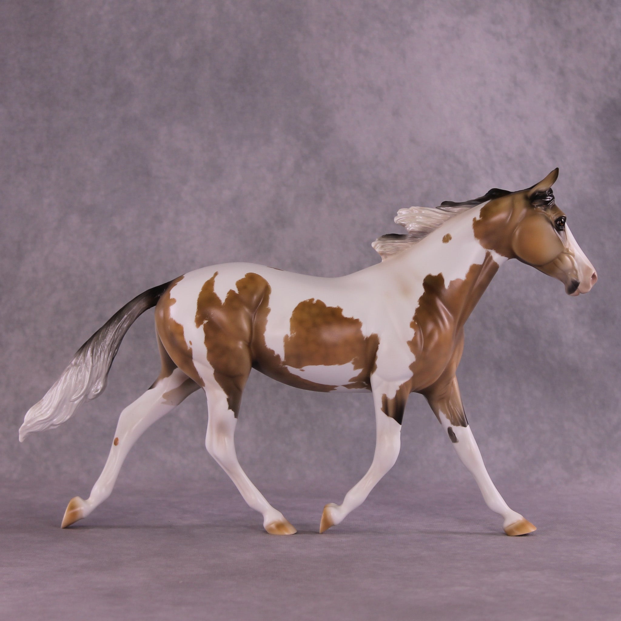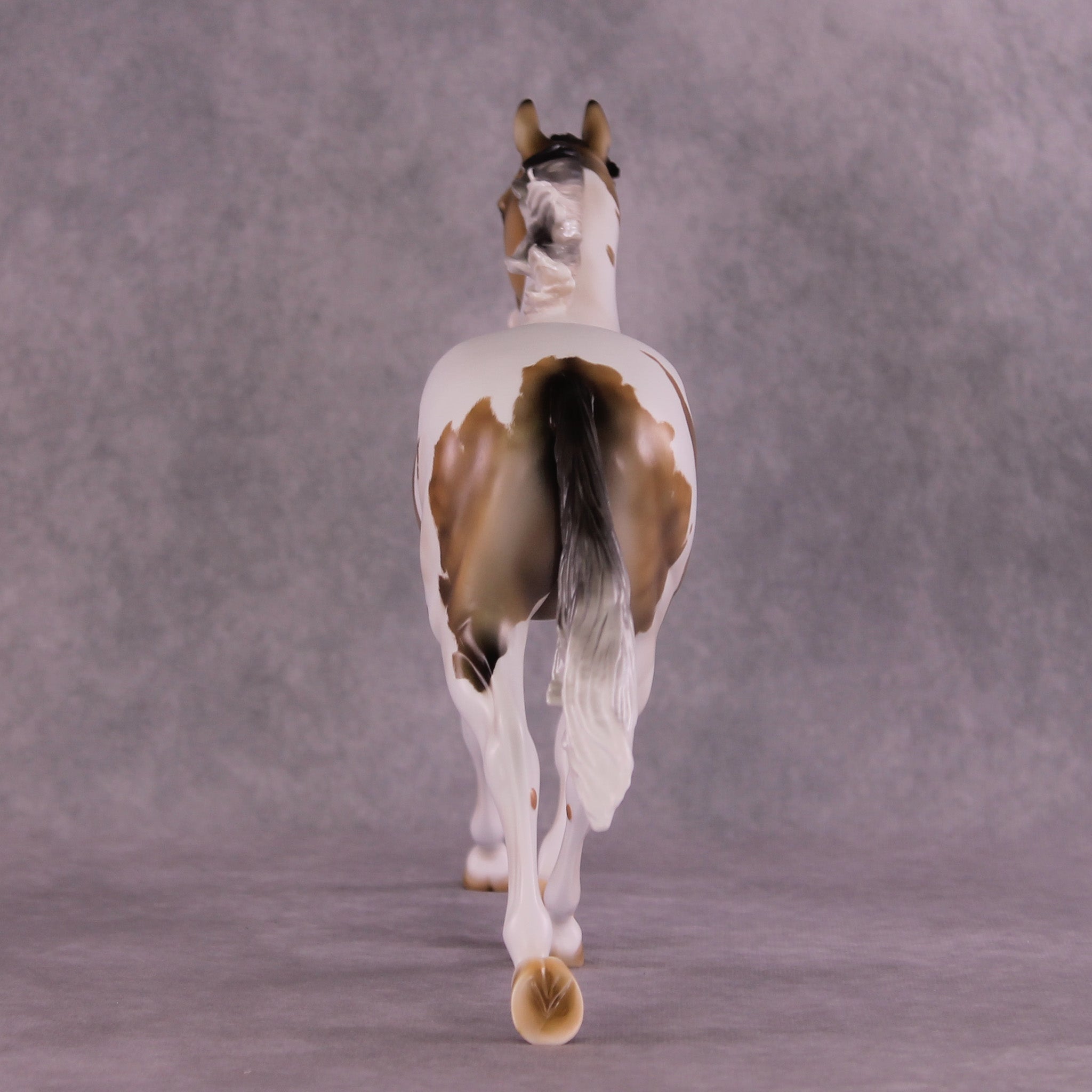 We all have a soft spot for the Palouse sculpture, and this example by Mindy is just gorgeous. She gave her a stunningly detailed heavily dappled sooty buckskin pinto design, with shaded whites, blue eyes, loads of etched hair detailing and mapping, a shaded mane and tail that follow the design of her pinto pattern, and more. Finished in a light satin sheen, she is ready to happily trot into your collection!