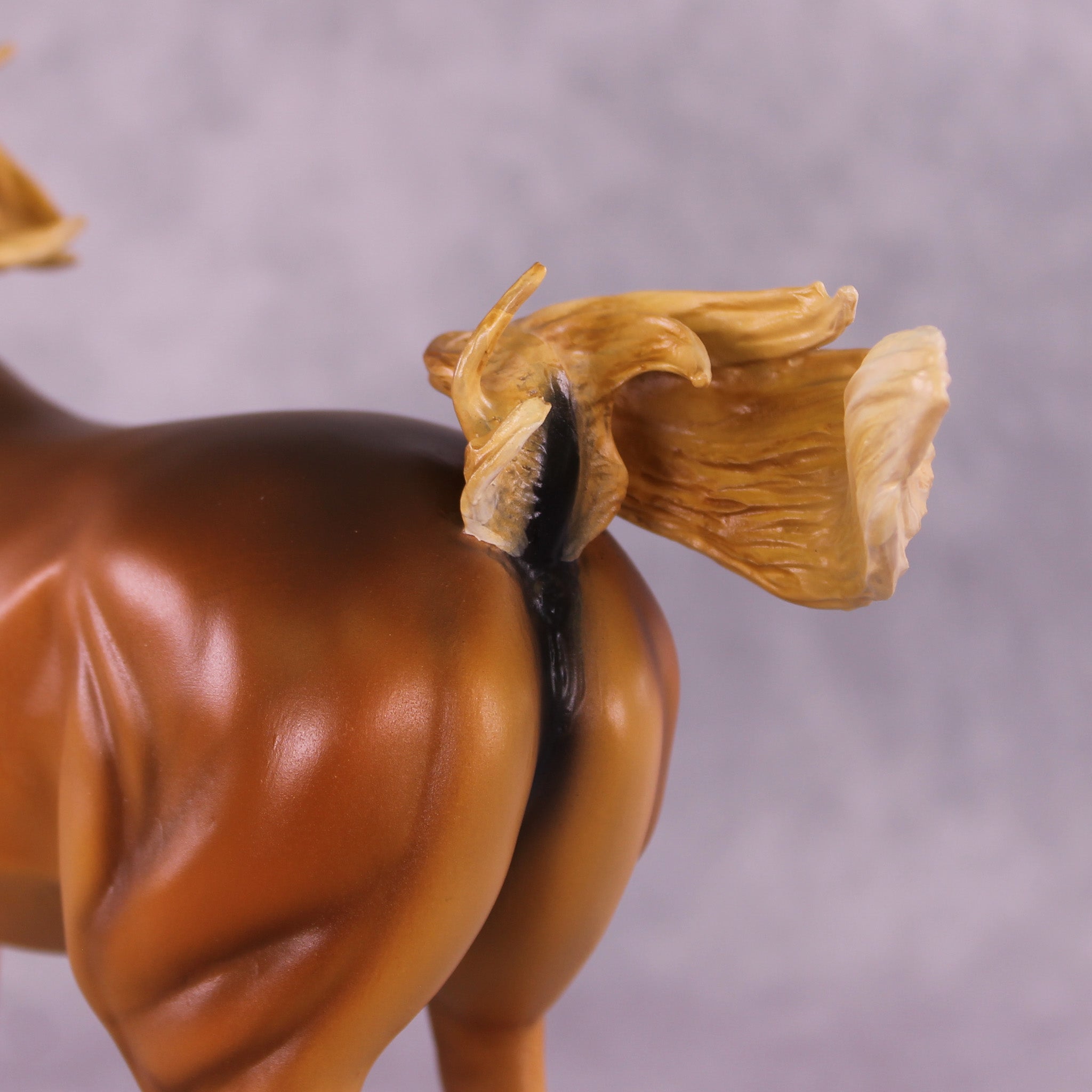 This piece was originally named Hurricane Erin, and then I used that name on the pink donation horse I made a few weeks ago! What can I say, it’s been A Month. Re-named to The Red Dragon, this piece keeps ALL her intensity and warns everybody to keep clear. An extreme customization on our Arabian Mare mold, Tiffany gave her deeply pinned ears, a windblown mane and tail with tons of action, and an open snarling mouth with individually carved teeth and tongue, plus loads of detailing around her mouth and nostrils. Painted to – of course – a bright flaxen chestnut, this is a once-in-a-collection kind of piece!
