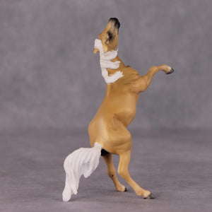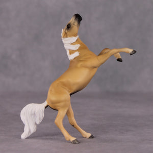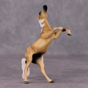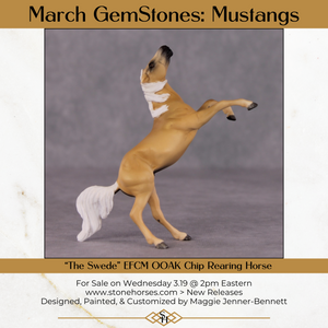 “The Swede” has a whole new look – Maggie gave him a straightened and dramatically tossed head and neck, plus extra mane on both sides of his neck and a whole new sculpted tail. She then finished him to a lovely golden palomino with immaculately detailed hooves, this one looks like a whole new mold!