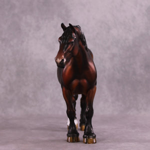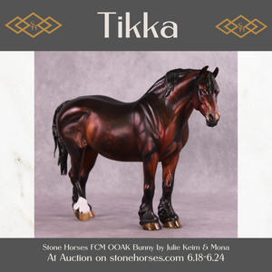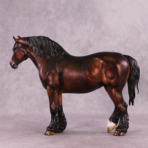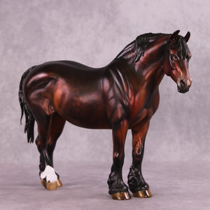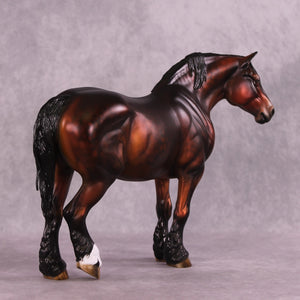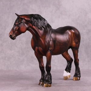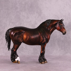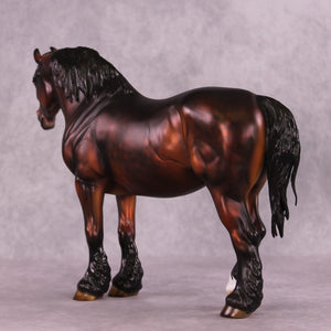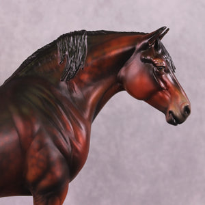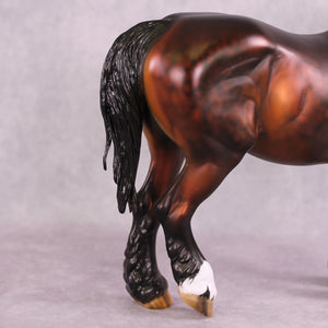 “Tikka” displays some of Mona’s lovely customizing in her extra long mane falling on both sides of her neck with extra tendril detailing, and her shorter ‘working draft horse’ tail with loads of detailing. Julie finished her to a jaw dropping dappled red metallic bay with striped hooves and one low sock, she is just stunning!