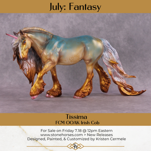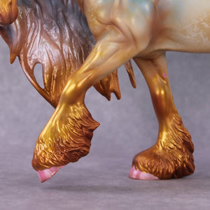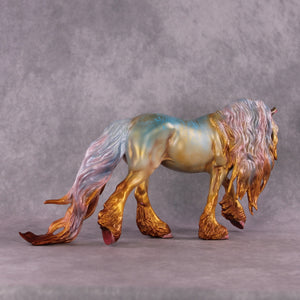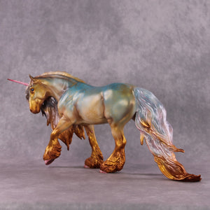 Tissima is our Irish Cob sculpture, who makes a perfect unicorn if we do say so ourselves! Kristen gave him an extra customized longer and more detailed mane, tail, and forelock, along with an extended front leg to change his walking stance – plus a unicorn horn of course! She then painted him to a stunning peach/gold/teal filagree with pink detailing, he just glows in person and the dimension Kristen got with these color combinations is just unreal.
