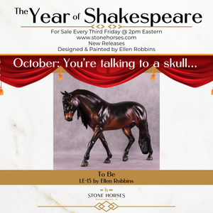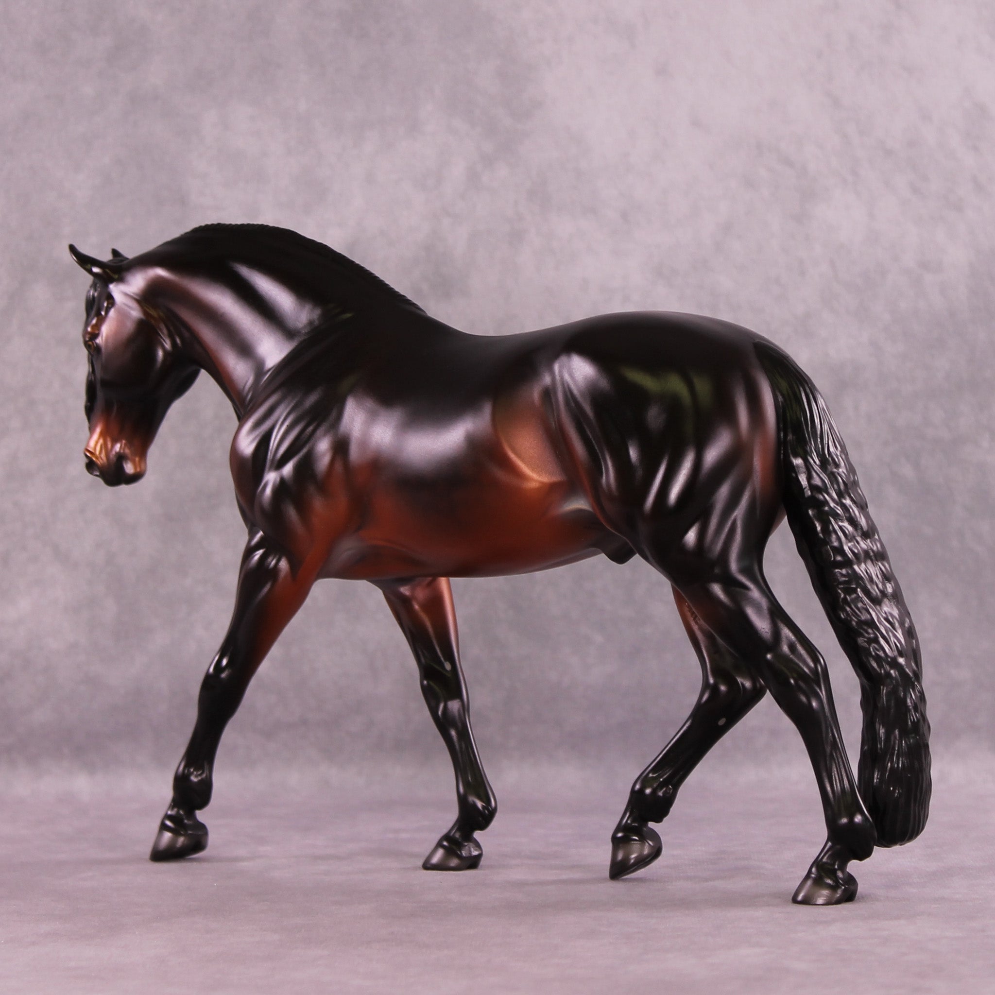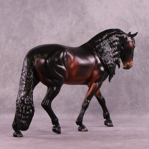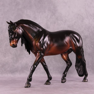 To Be represents Hamlet in a stunningly detailed dark dappled bay full of depth and dimension. He is presented on our Irish Draught mold featuring a long wavy mane and forelock, with customized extra long tail.