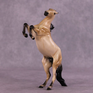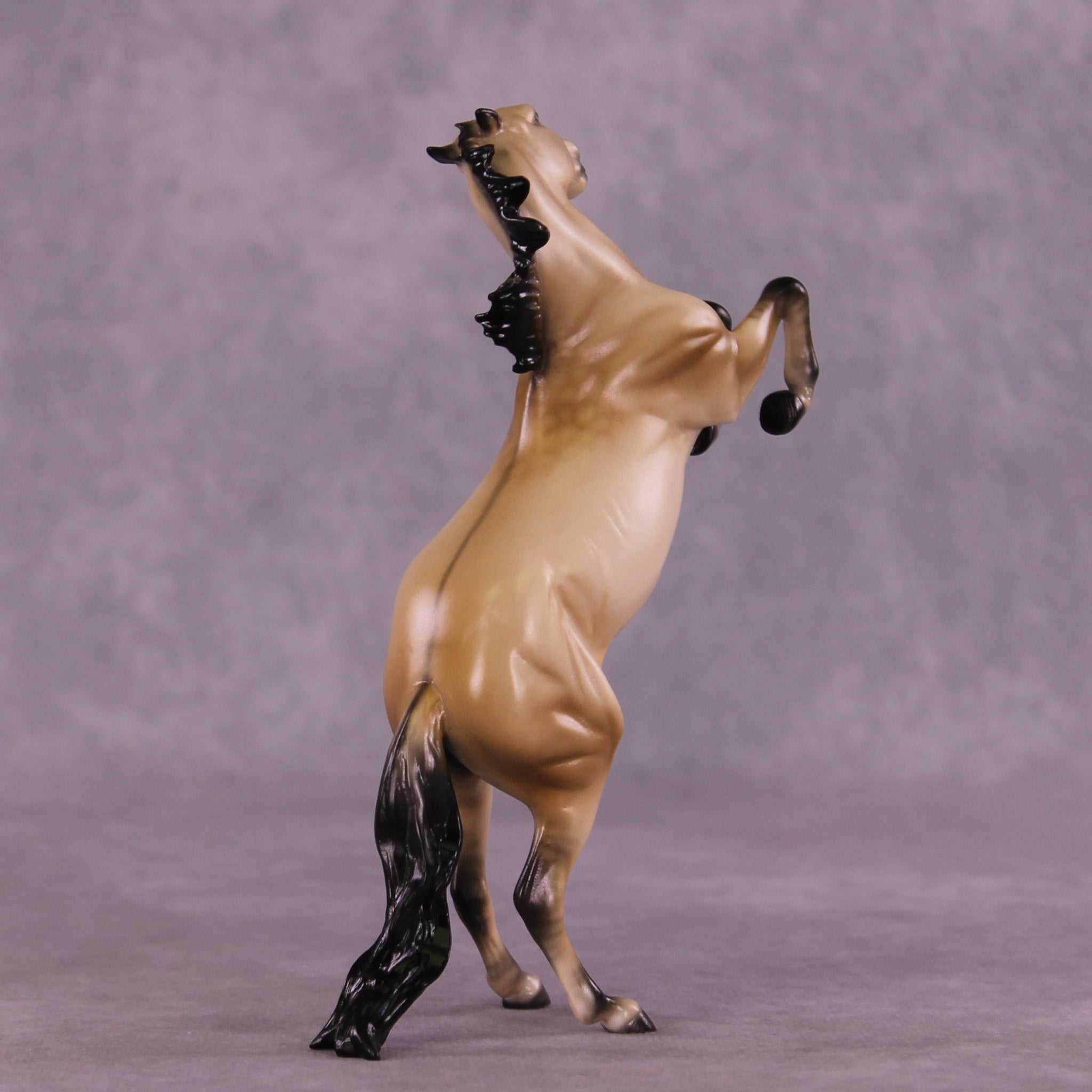 Matt worked with our Pebble Mustang sculpture to create this new take on a classic pose! He has customized front legs to be in a matching tucked position, and a sassy head and neck turn that changes his whole outlook on life. Ellen painted him to a gorgeously detailed dun with a dorsal stripe, leg barring, and dramatic shading through his whole design. He is available in all finish options.