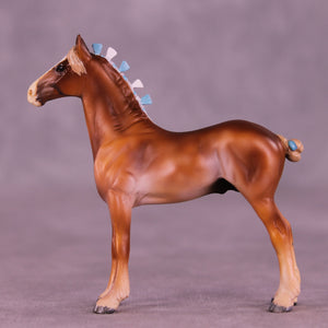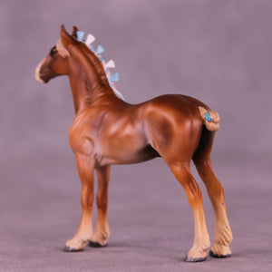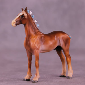 Kristen gave our Chip Drafter the total show horse makeover! She first took the clippers to him, customizing his lower legs to a cleaner look with less feather on all four legs. She gave him a proudly lifted and straightened head and neck position, a new customized mane with draft show horse flights in white and blue, with matching white and blue ribbons in his tail. He is painted to a stunningly shaded Belgian chestnut with a blaze, ready to win. He comes in a light satin matte finish and no finish changes are offered on this piece.