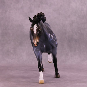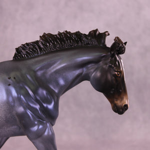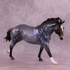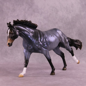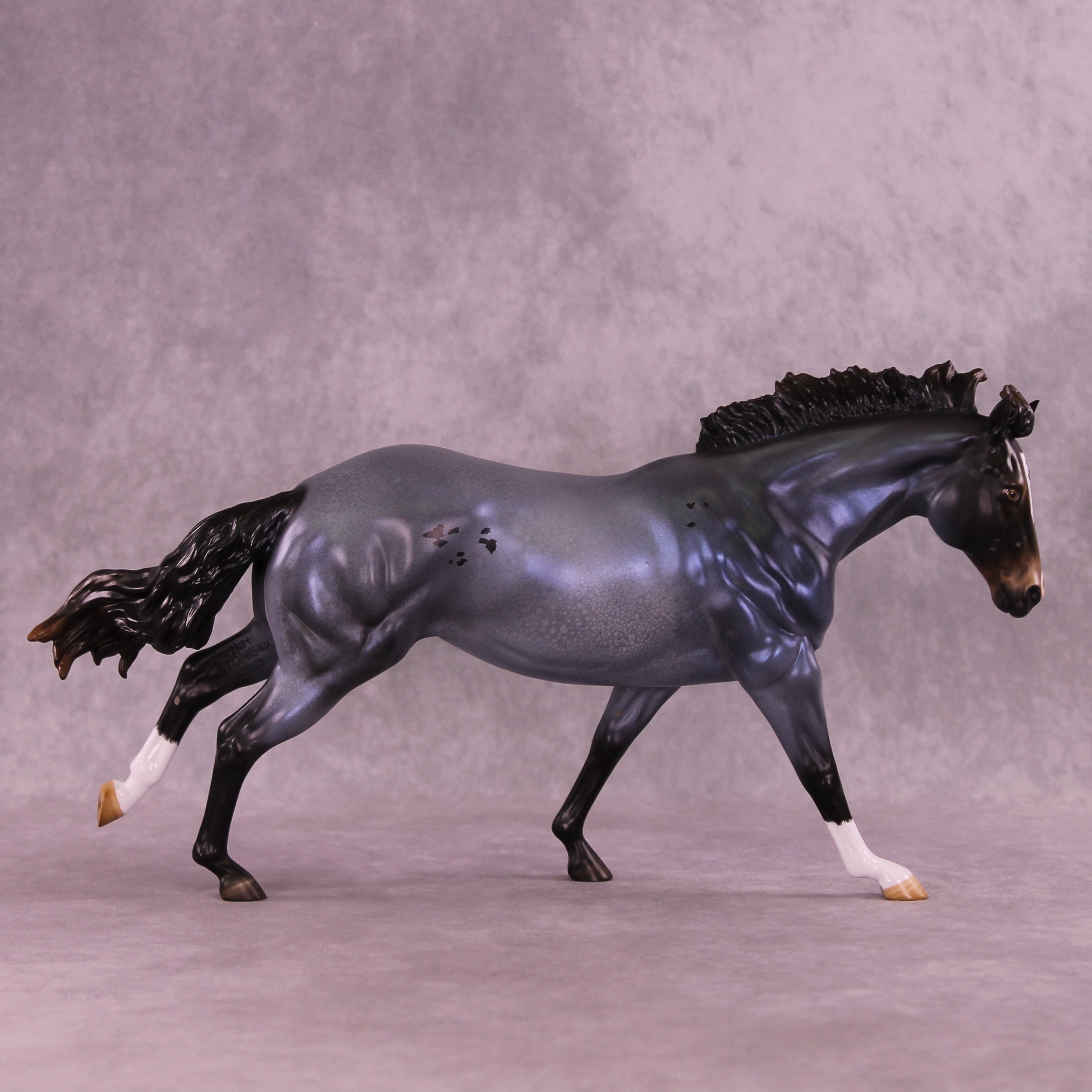 Angela worked with our Remington sculpture here, featuring his short flying mane and motion filled flowing tail. She painted him to a stunningly detailed blue roan with corn spotting, two socks, and a lovely star snip combination face marking. He is finished in satin matte and no finish changes are offered on this piece.