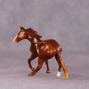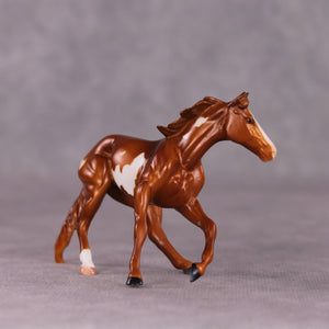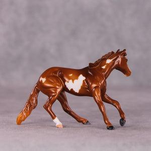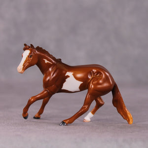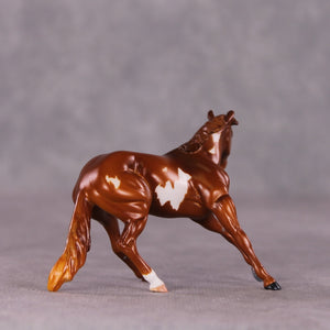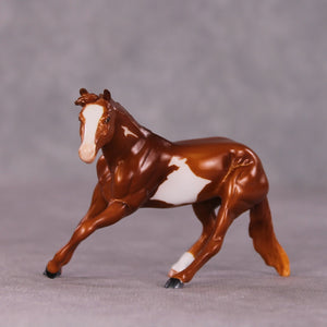 “U R My Sunshine” is a lovely little cutting horse chip that Missy painted to a glowing shaded chestnut overo with a wide blaze, nose pinking and one sock.