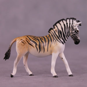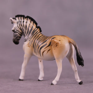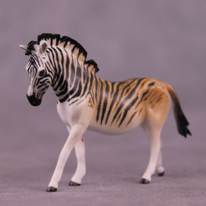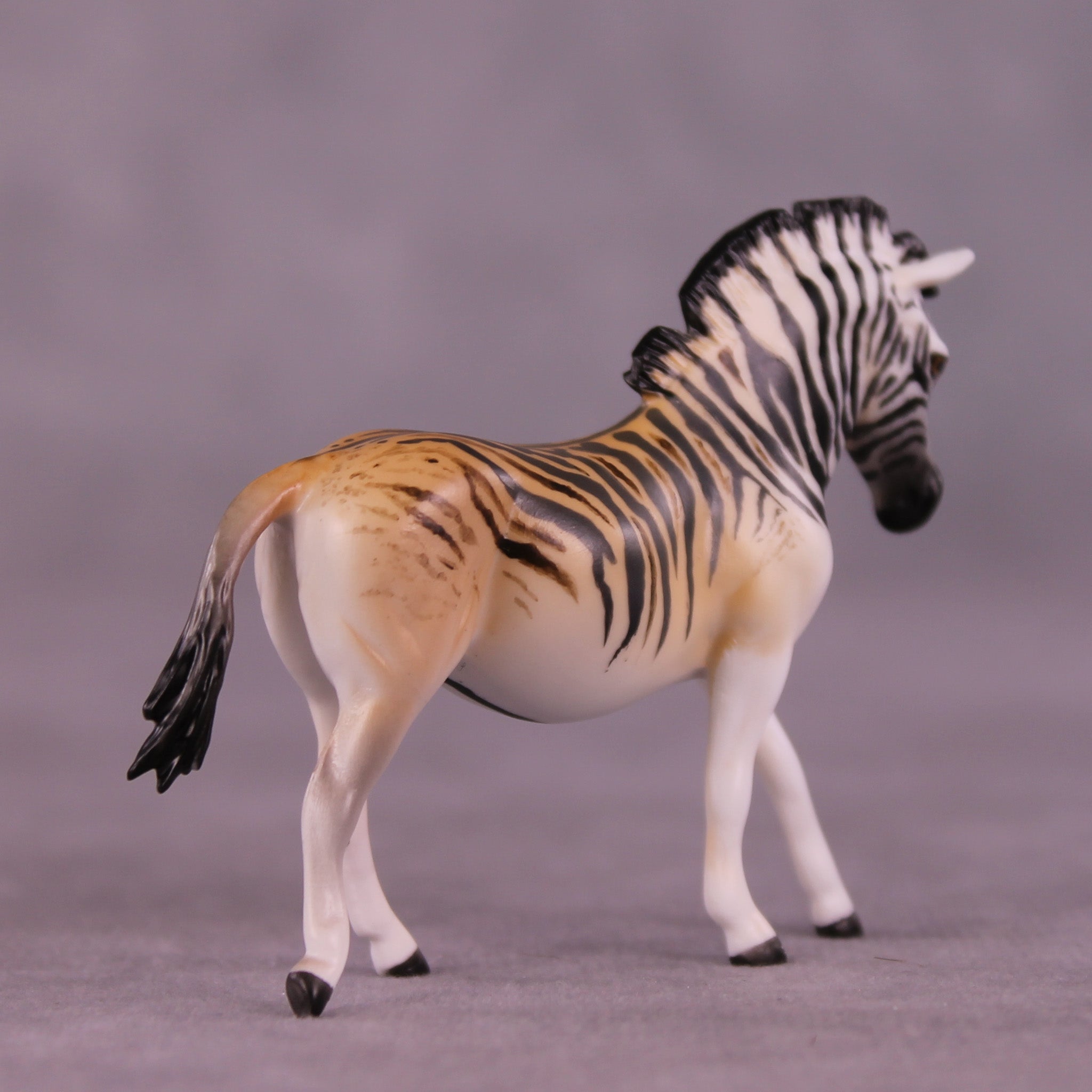 Until You Showed Up is just over 2” tall but do not let that slow her down in the show ring. Mel began with our Chip Pony mold and gave her a whole makeover to her new Quagga form. She has the stiff standing-up mane, adjusted gait and stance, Quagga style tail, and extra added sculptural details throughout. Tegan then painted her to a stunning warm striped Rau Quagga design with detailed stripe edges, ghost striping in her barrel with black and brown stripes balancing each other perfectly, dramatically shaded creamy legs that blend gorgeously into her body, and impossibly tiny striping through her face. A tiny treasure! Finish changes are not available on this piece.