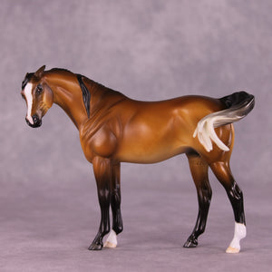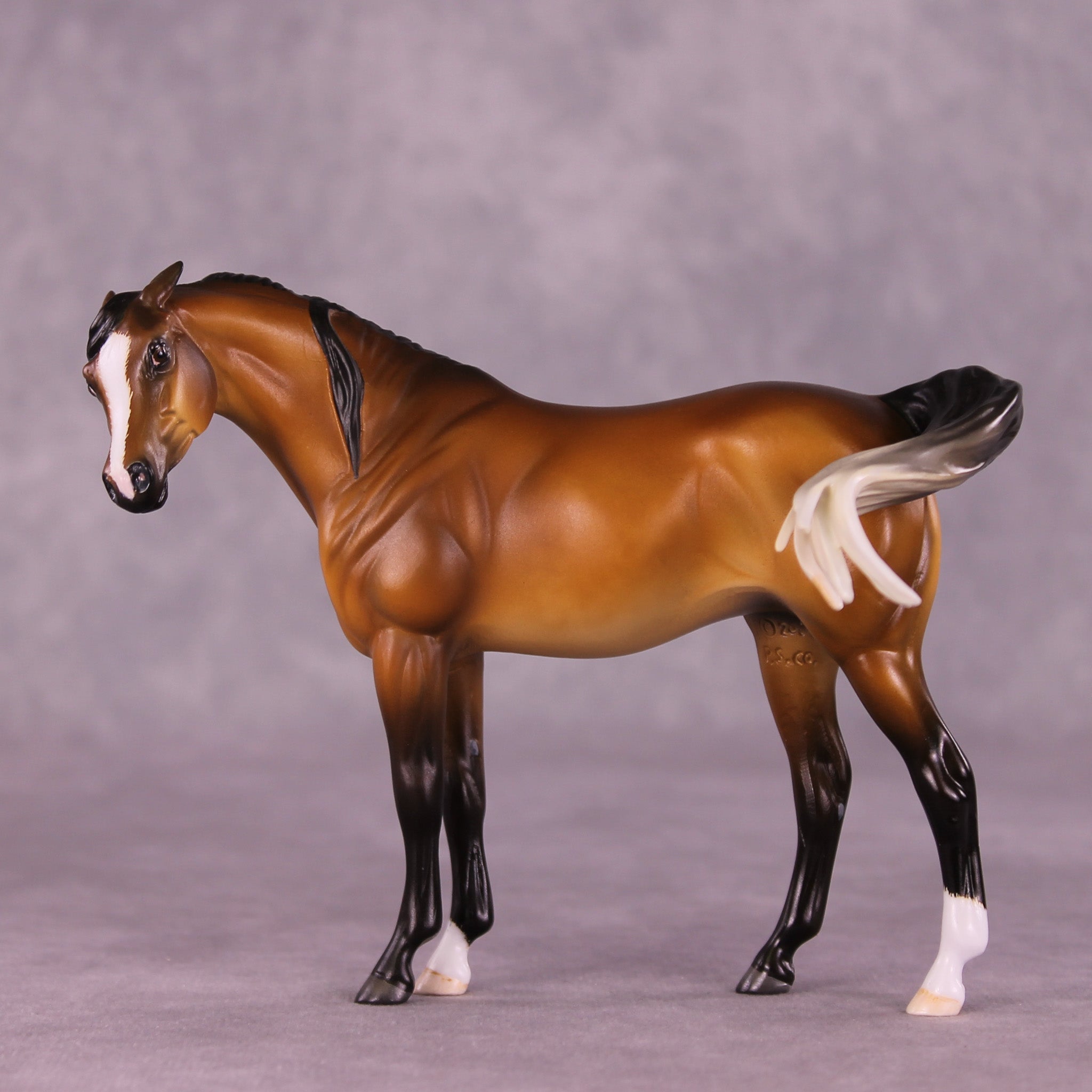 This piece is a gorgeous makeover of our Pebble Arabian mold, featuring a dramatically customized and turned head and neck, pinned ears, customized mane and tail, and finished to a beautiful shaded bay with etched marking edges and a gulastra plume tail.