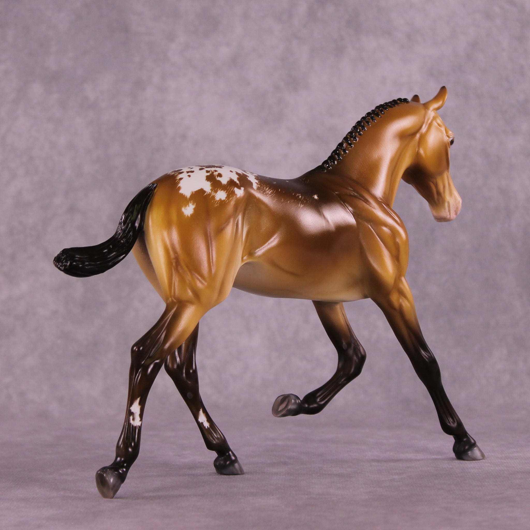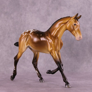 This piece began as our Arabian Yearling, and Tiffany gave her a whole new head and neck along with customized mane and tail to an araloosa sporthorse yearling. She is finished in a gorgeous bay appaloosa with tons of hand-etched hair detailing in her blanket and white markings, she is ready to win!