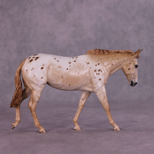 Whippersnapper is a playful pebble Mule by Sheryl Leisure. This little lady features the short mane customization on this mold, and has a delicately shaded chestnut paint job with realistic halo spots. Sheryl’s unique style brings a dimensional, lifelike feel to this piece. Though she may be a young whippersnapper, this is a pint-sized pony you’d be lucky to have on your lawn!