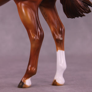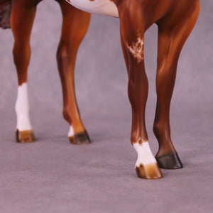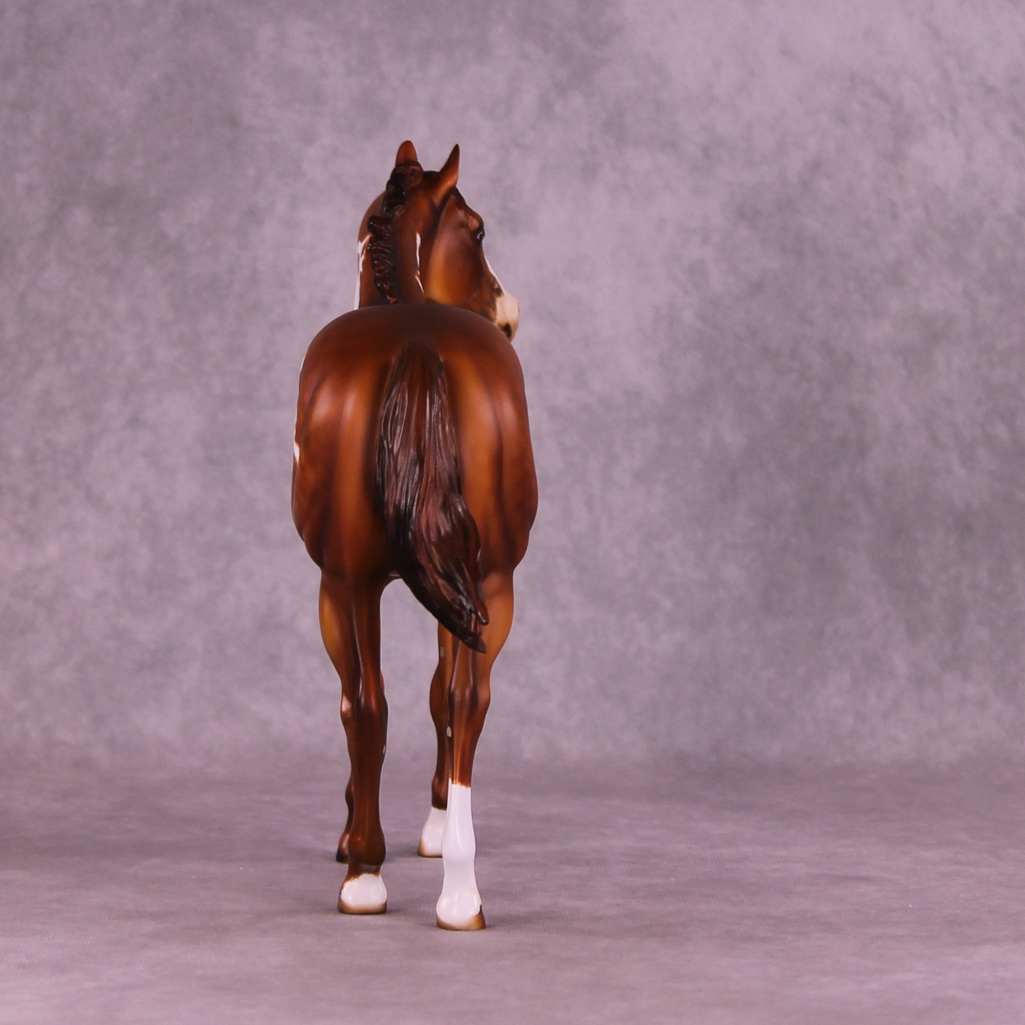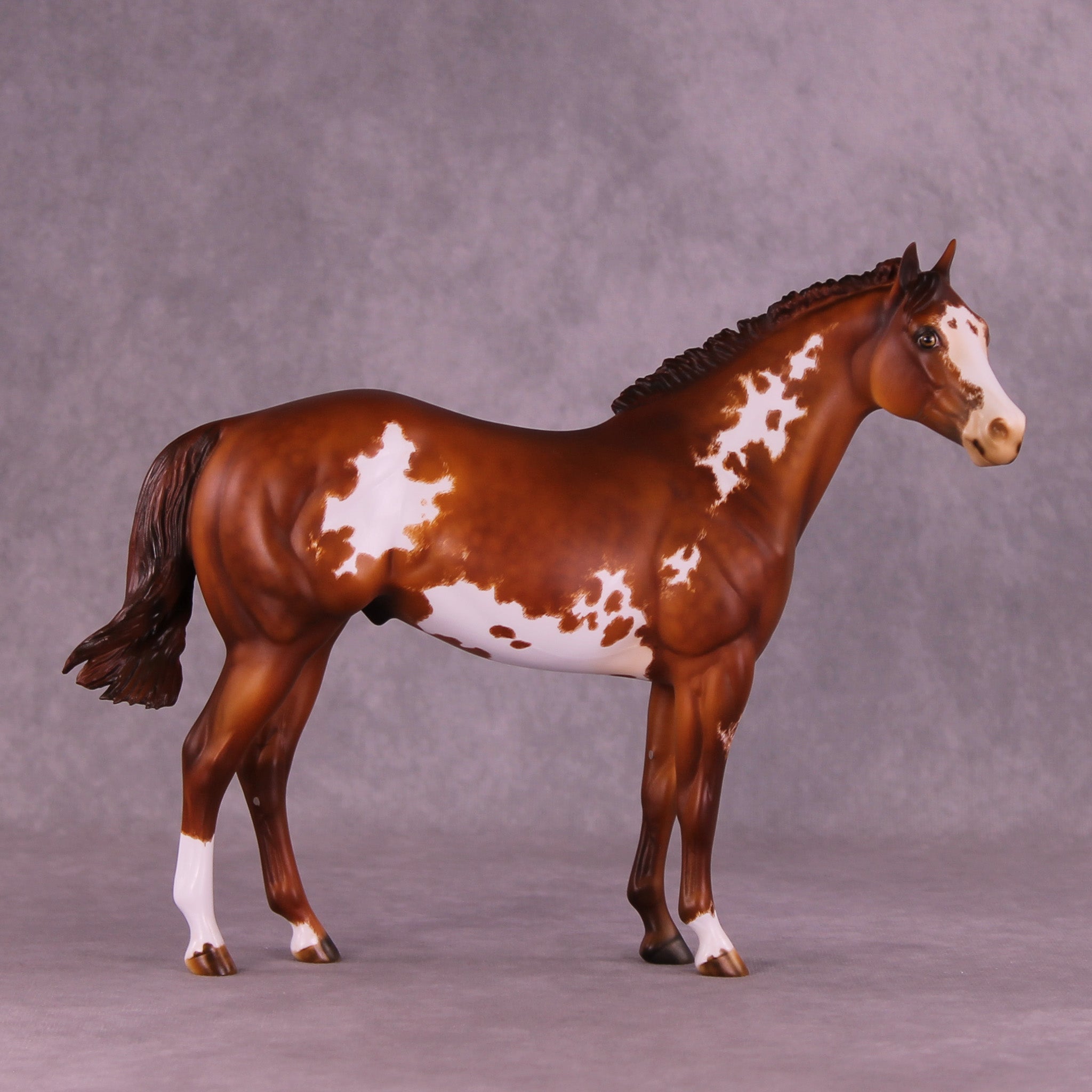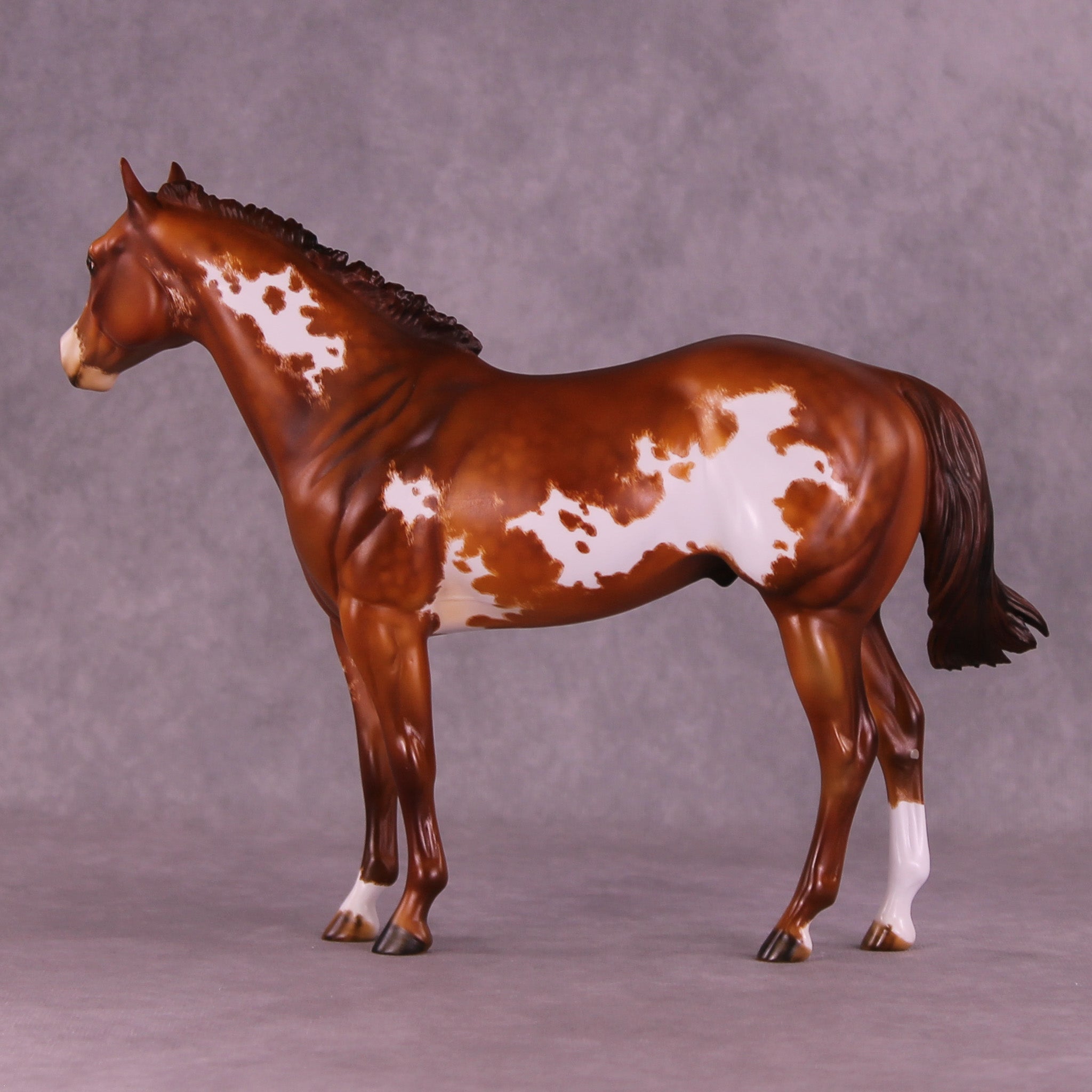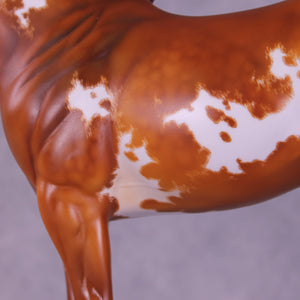Mel took our Ideal Stock Horse and gave him a super cute short upstanding mane, and then customizedshort banged tail that is blowing in the breeze with extra tendril detailing. Julie painted this piece to adelightful dappled chestnut pinto withtons of etching and mapping aroundall of his white markings. He has hoof stripes, a super intricate shaded face marking, and just loads of details packed into every inch. All finishes are available on this gorgeous guy.