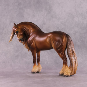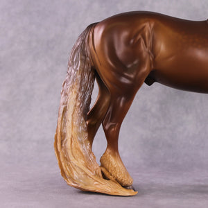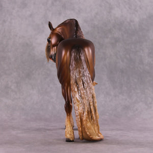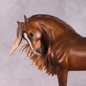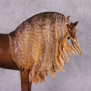 “Wild Child”. Wow. Where do I even start with this piece? The pinnacle of Mona’s customizing expertise and Caroline’s finish work prowess in one horse. He has an extreme head tuck combined with a heavy, heavy crinkly mane and tail, and feathers added to balance him out. Caroline painted him to a warm and toasty dappled chestnut with loads of drama and shading, with a blaze. Just click through his photos, he will be a piece that is remembered for a lifetime.