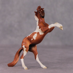 “William Kidd” is painted to a lovely red chestnut pinto with four socks and lovely detailed hooves, eyes, and facial shading.